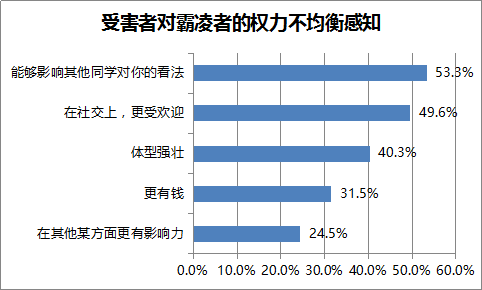美国2018年一项调查研究了霸凌者与受害者之间的权力不均衡(Power Inbalance),调查显示超过一半的受害者觉得霸凌者能影响其他同学对自己的看法。