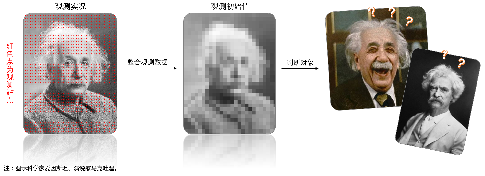 形象来说,我们用这种方式来观测爱因斯坦的照片,红色是观测站点,看得出来已经很密集了,可是结果依然是不尽如人意。那如果我们用这样一个观测初始值再去预测谁是爱因斯坦,也必定是傻傻分不清楚。那讲到这里大家可能会想,只要观测完全精确不就好了吗?那么,观测到底能不能精确呢,现在的观测手段除了地面气象站还有卫星、雷达等多种手段,可谓是海陆空全方位观测。但是很遗憾,即便未来科技再发展,手段再提升,想要精确测量覆盖地球,高度几十公里的大气,也基本上是不可能的。