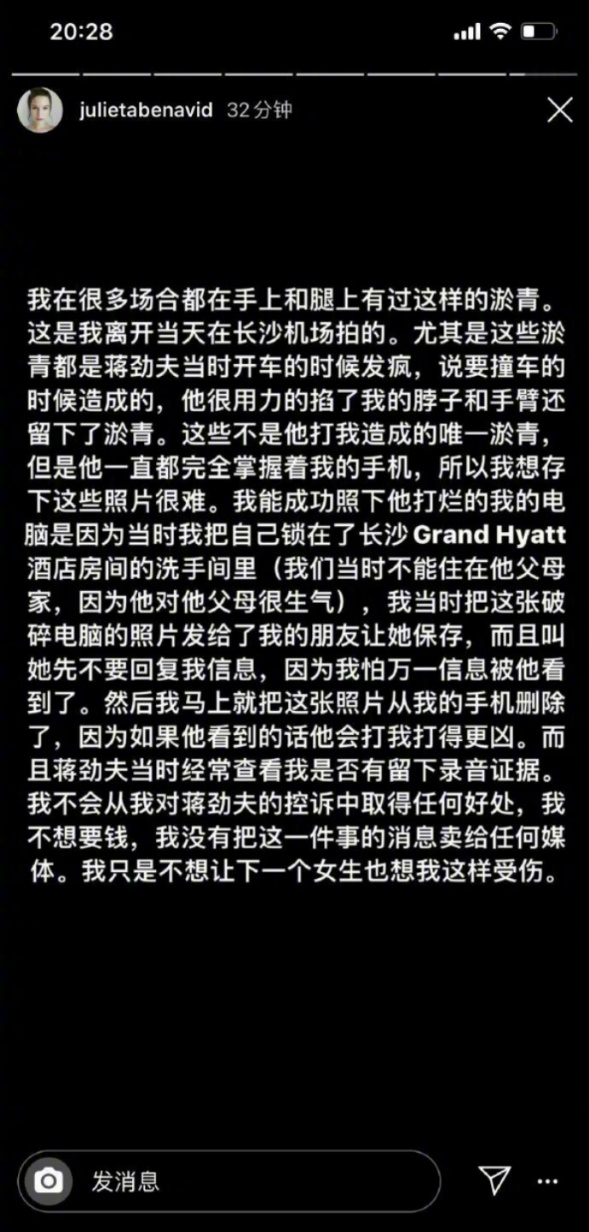 2019年11月26日,蒋劲夫乌拉圭女友Julieta发文控诉其家暴。称蒋是个控制狂、暴力狂。而此前蒋劲夫已经有过家暴案底,他的日本前女友中浦悠花曾晒出淤青照指控其家暴。27日,Julieta再次发文控诉其家暴,并晒出手臂淤青的照片,同时她表示她的手机被蒋劲夫掌握,“如果我想拍照片保留证据,他会打我打得更凶”。