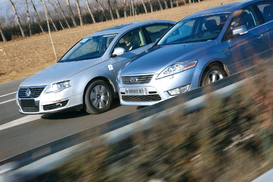 如果蒙迪欧-致胜在国产以后仍然延续的是欧洲版本上搭载的2.5 T发动机,那么本章节的对比就完全没有必要了。好在进入中国后,致胜的发动机将只搭载2.0 L和2.3 L两款Duratec HE汽油发动机。就我们手头的这款2.3豪华运动型车来说,虽然厂家一直回避是否与Mazda6共用发动机,但无论是发动机的各项参数,还是实际的驾驶感觉,都有那么一点点的熟络感。致胜的这款2.3 L发动机的最大功率为118 kW,最大扭矩为205 N?m。在功率与迈腾相同的情况下,在扭矩上要大大低于迈腾的250 N?m。扭矩上的差距全部拜迈腾发动机上的涡轮增压系统所赐。所以单从静止急加速的表现来看,迈腾在多出的45 N?m扭矩的帮助下,以及涡轮增压的介入时机同样比较早的情况下,提速显然要比致胜快许多。迈腾的0~100 km/h加速时间根据我们粗测在10 s以内,而致胜的粗测结果则在10 s开外了。