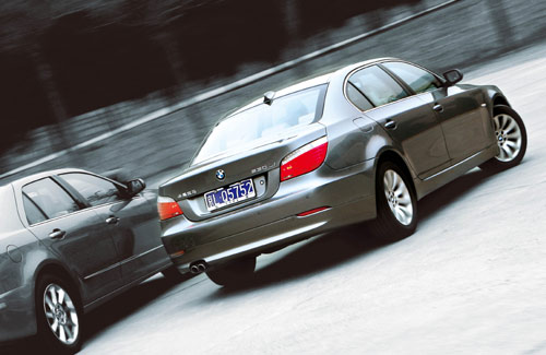 试驾这几款车型,完全没有必要为动力担心,因为即使是发动机排量相对最小的E280和530Li,3.0 L的排量足以驱动不到2吨的车身。奔驰为E280装备了采用连续可调进排气凸轮轴和智能气门机构的3.0 L V6发动机,功率及扭矩分别为170 kW和300 N•m,这样的数据让我甚至有点怀疑是否有一个涡轮增压器在发动机舱盖下面。而宝马则为530Li装备了直列6缸自然吸气式发动机,这也是四款车型中唯一采用直列布局的车型。这款发动机的扭矩输出与E280完全一样,但是最大功率却提升至190 kW。在最大扭矩输出转速也是完全相同的情况下,E280 0~100 km/h 7.3 s加速时间与530Li也是相差无几,0.1 s的差距即使换成舒马赫估计也感受不出来。所以我们在E280和530Li上都能够感受出强烈的推背感,深踩油门,充足的动力在稍作迟疑后,马上传递到驾驶座的椅背上,后背的敲击感在这一刻可以很好地体现在E280和530Li身上,车速提升很快。虽然20 kW的功率差异并不算小,但在电子限速装置的作用下,E280和530Li的最高车速都被限制在250 km/h,看来这20 kW的差距只有在解除电子限速的束缚下才能体现出来。
