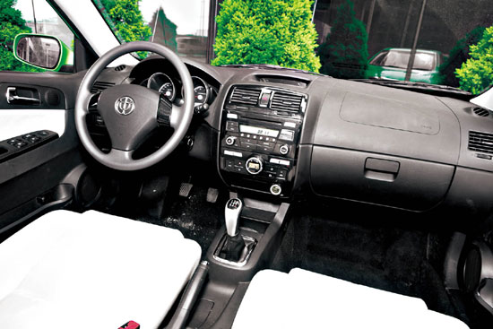 设计师为骏捷FRV设计了全新的内饰布局,除了三辐式方向盘上明显的中华标志可以昭示车辆的出身,无论是整体布局还是细节处理,会让人以全新的眼光来审视,黑白相间的按钮颜色以及形状各异的按钮轮廓都丰富了视觉看点,让车内有了视觉中心,少量银色金属饰条的适当点缀营造了时尚前卫的气氛,而炮筒式仪表板则进一步体现了动感的视觉效果。但整个内饰的材质多以塑料为主,即使是中控台的亮色漆面处理,多少还是会让人感觉到些许灰暗,不利于档次的提升。座椅和内饰板鲜明的色彩对比稍稍感觉有些跳跃,好在骏捷FRV除了这款至酷黑旨在为运动服务外,米黄色系会更加适合温馨的小康之家。