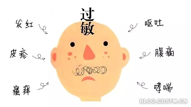 具体表现为肌肤发痒、嘴巴肿胀,喉咙痒,呼吸道急速收缩或膨胀致命。