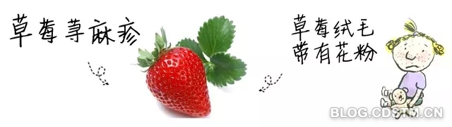 是由草莓表面的“茸毛”带有的花粉引起的荨麻疹,全身瘙痒,还会伴有打喷嚏,口腔和咽喉会感到发痒和肿胀。
