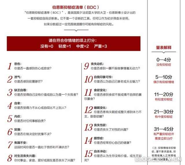 抑郁症有轻重之分,轻的时候自己可能没太大感觉,只是容易觉得没意思,易疲劳或者身体上感觉不太舒服。如果严重的话还会危及生命,它会让人陷入到绝望当中无法自拔,想去结束自己的生命而酿成悲剧。