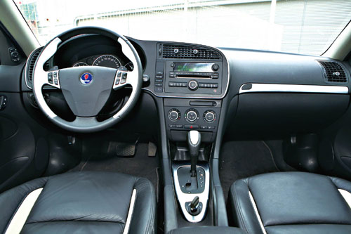 新萨博9-3所配备的6挡手/自动一体变速器来自爱信,方向盘上有换挡拨片,但手动模式不能像宝马那样在D挡位置也可以激活,一定要把换挡手柄置于M位置才行,运动模式的功能键也没有出现在变速器面板上,而是被安置在了中控台上。这款变速器的适用范围相当广泛,就连保时捷911也选择过它,自动模式下的反应极其敏捷,虽然9-3 Aero的整备质量达到了1 685 kg,但起步瞬间却能让你感觉到轻盈,而这一点甚至宝马的很多产品也做不到。