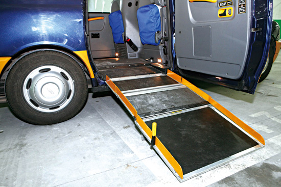 TX4最特色的地方还是能为轮椅服务。TX4的右后门处隐藏有一个折叠踏板,可以用它架设一个坡道让轮椅直接进入车内,上车后轮椅也能用特殊的安全带固定住,以防止滑动。TX4的设计者为这个坡道考虑得非常周到,通常情况下折叠踏板可以直接架在马路路沿上,但遇到平地时,为了降低坡度,后行李厢内还准备了一块延长板。此外,坡道两侧还可以装上护板,以防止轮椅滑落。