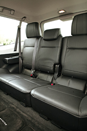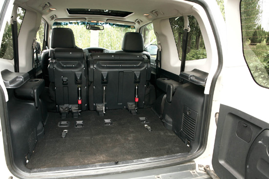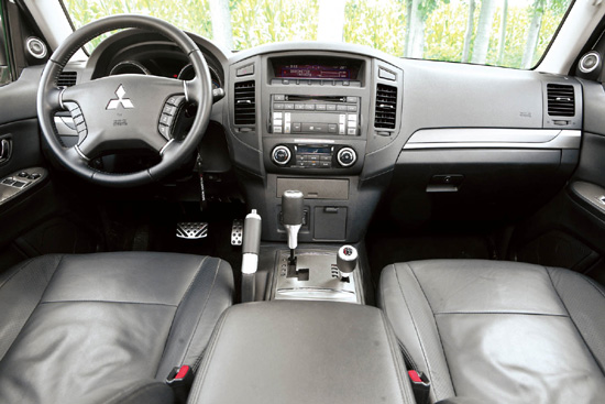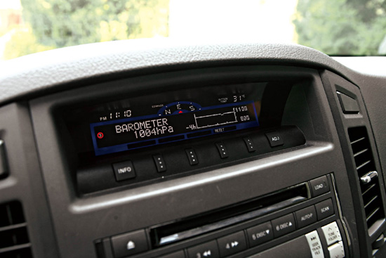 与五门版相比,三门版帕杰罗车内的座椅组合方式并不算丰富,只是后排可以按4:6比例向前折叠,形成一个实用的大容量行李厢。相对其它豪华SUV,三门版帕杰罗的配置也较为简练,除了头顶上尺寸超大的天窗比较惹眼之外,有特点的还有中控台正上方的副仪表,它不但能提供时间,方向和音响等信息,还能以图表的方式显示4小时之内的气压、海拔高度以及温度变化,这些显然会对越野迷们有帮助。