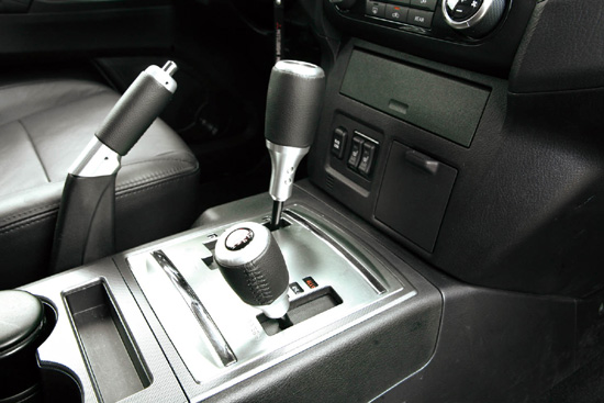 帕杰罗的5挡INVECS-II手/自动一体变速器具有学习驾驶者驾驶风格的功能,由此也能选择更贴近个人风格的换挡时机,但这项功能并没有让我们印象深刻,D挡模式下变速器还是会在2000r/min左右时悄悄升挡。手动模式下你可以让转速逼近红线,但为了保护发动机,电脑还是会对不合理的操作加以控制,所以你要想在60km/h的车速下去强降至1挡,电脑肯定不会让你胡来。