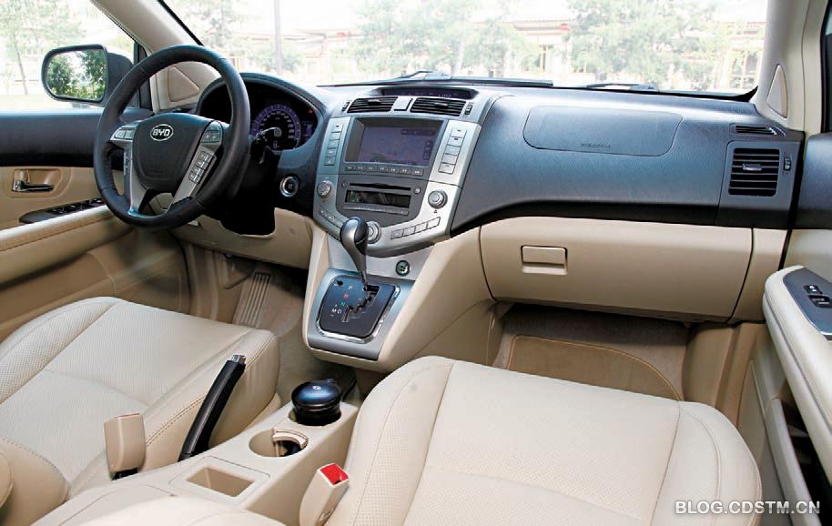 老实说,我对于高配置、高科技的宣传将信将疑,这也更加深了我对其车内布局的探索欲望。比亚迪S6采用了上深下浅的经典配色,稳重中也不失淡雅,更容易让人接受。在盾型中控面板上集成了各种功能按键,双温区空调、5.1声道音响系统等等应有尽有,更重要的是,7英寸触摸式显示屏还融合了移动数字电视和比亚迪自主研发的语音电子导航系统,不仅能提供实时路况信息,还可以随时观看电视节目。除此之外,诸如一键启动、智能钥匙系统、自动收合后视镜也被装载其中。而我最喜欢的配置当属右前轮盲区可视系统,它可以通过安装在右后视镜下方的摄像头,将图像信息传输至车内显示屏,以确保盲区安全性。按下一键启动按键,4.3英寸双TFT仪表盘以飞翼式的模式依次展开,在时速表两侧有电子转速表、车内外温度等显示内容,并有两种颜色可供选择。