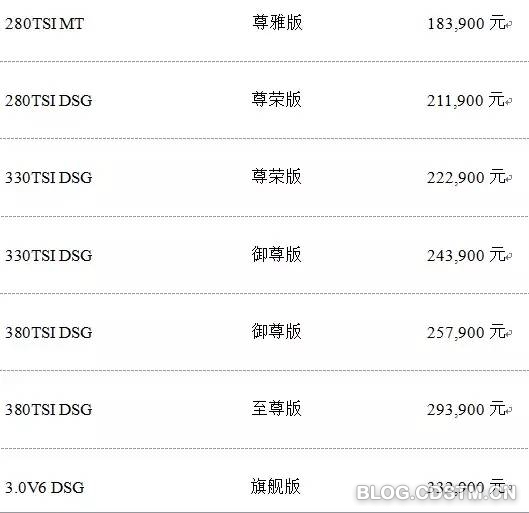 2016-01-19 15:35:001月18日,上汽大众全新帕萨特以全面革新之势在南京上市。新车提供280TSI、330TSI、380TSI、3.0V6四款动力选择,结合更丰富、前瞻的科技配置,共推出7款车型,具体售价如下: