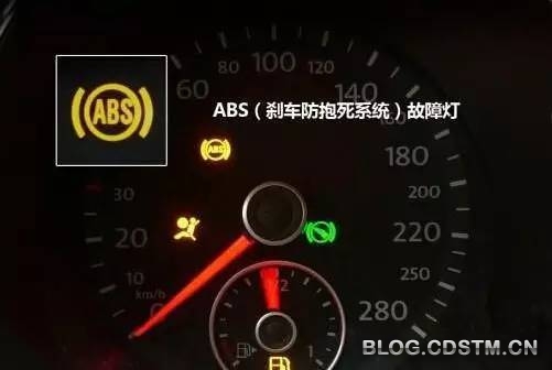 ABS报警灯在启动后会短暂亮起,要是行驶一段时间后还亮着的话,就表明ABS系统故障了,也就是刹车系统可能出问题了。这时也最好不要继续行驶了,要是无法刹车的话,真的会车毁人亡的。