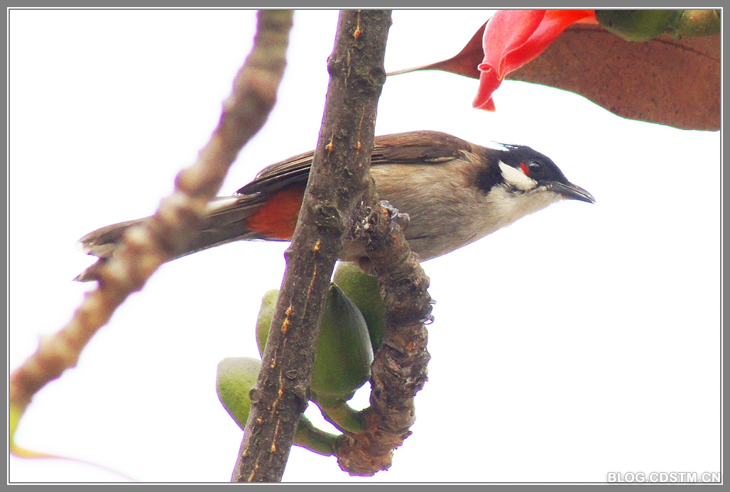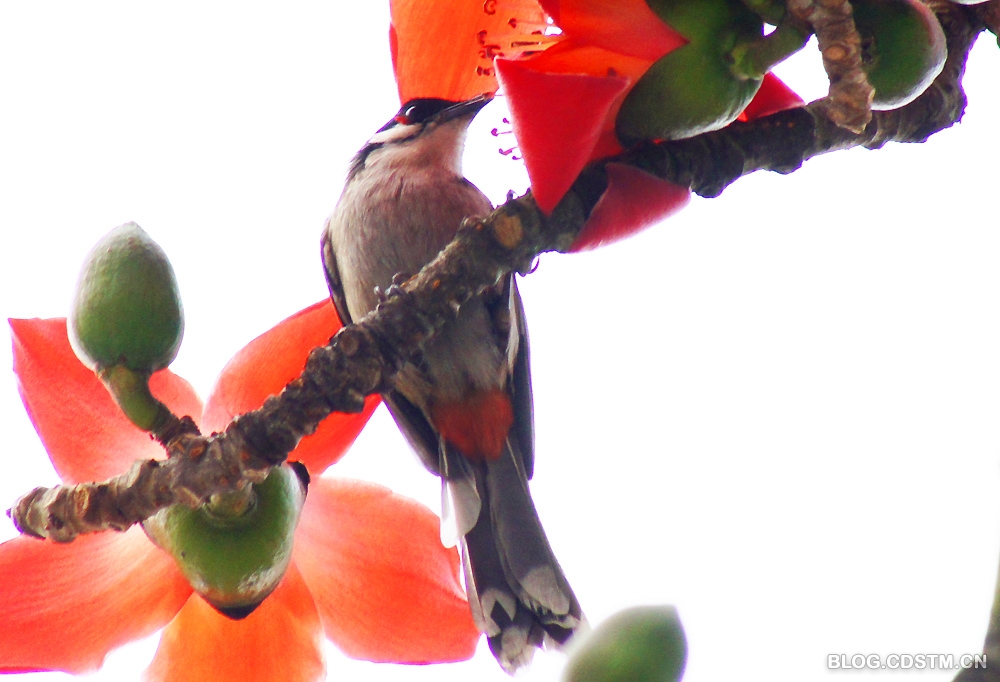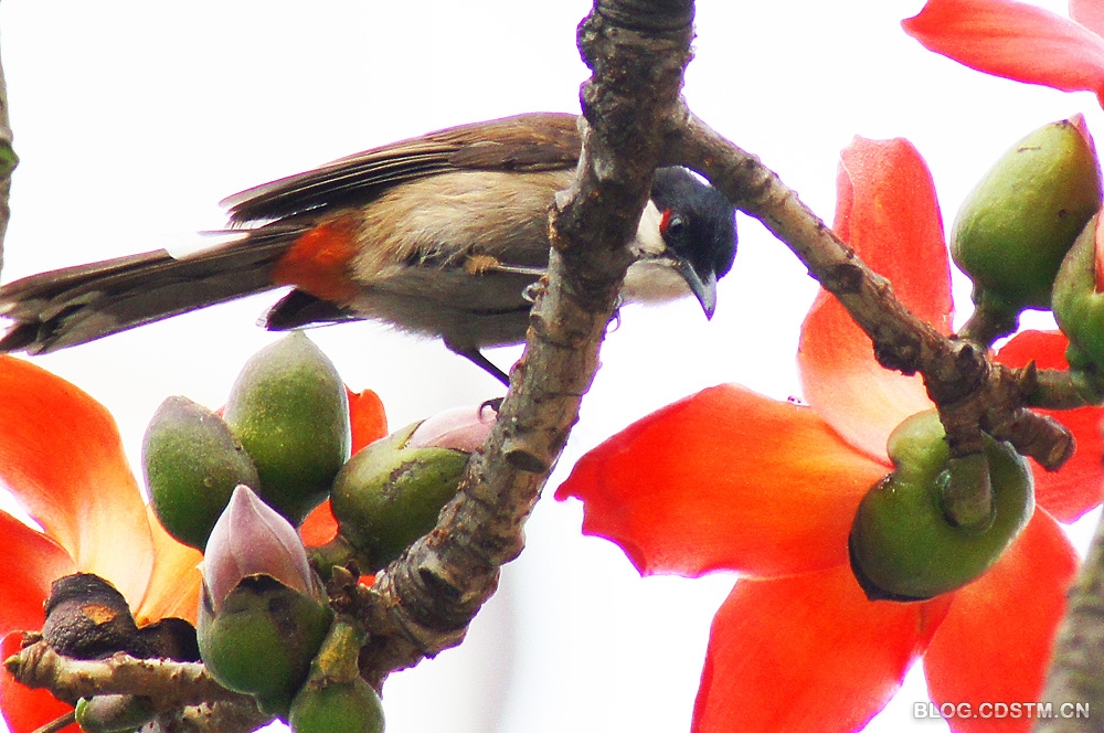 红耳鹎对木棉花情有独钟。当红棉灿笑枝头时,红耳鹎就在枝头花间飞来跳去,并不时吸吮花蕊中的密汁。