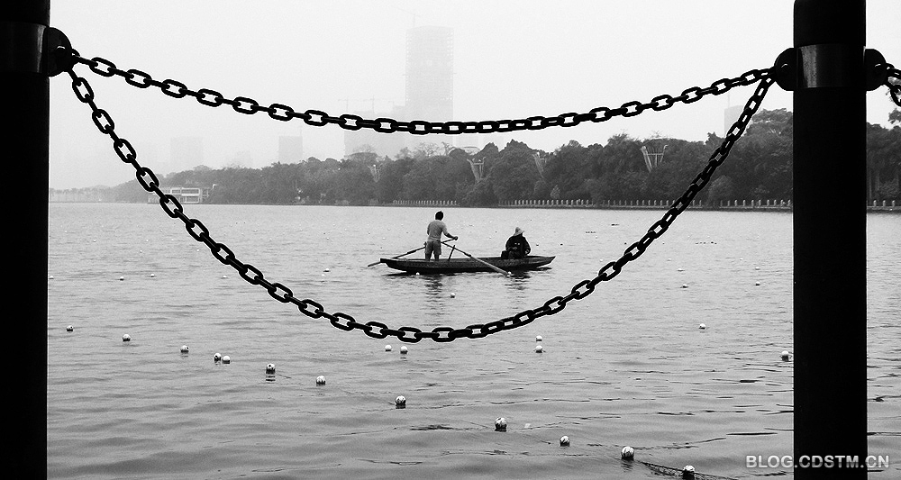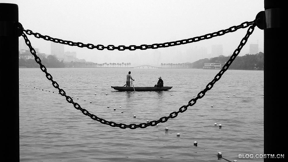 南湖是南宁的著名景点。4月18日清晨,在阴沉的湖面上,工作人员在撑船捕鱼。这组图利用观景台的防护链作前景,待船划进“嘴”中时,便将其定格下来,力求达到“嘴”里撑船的效果。