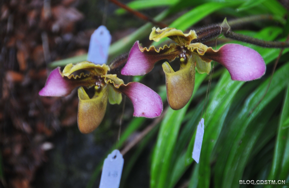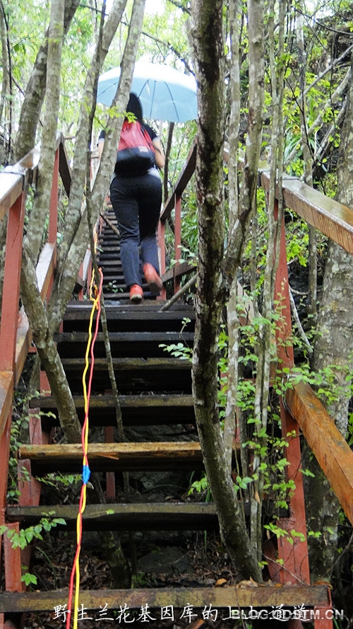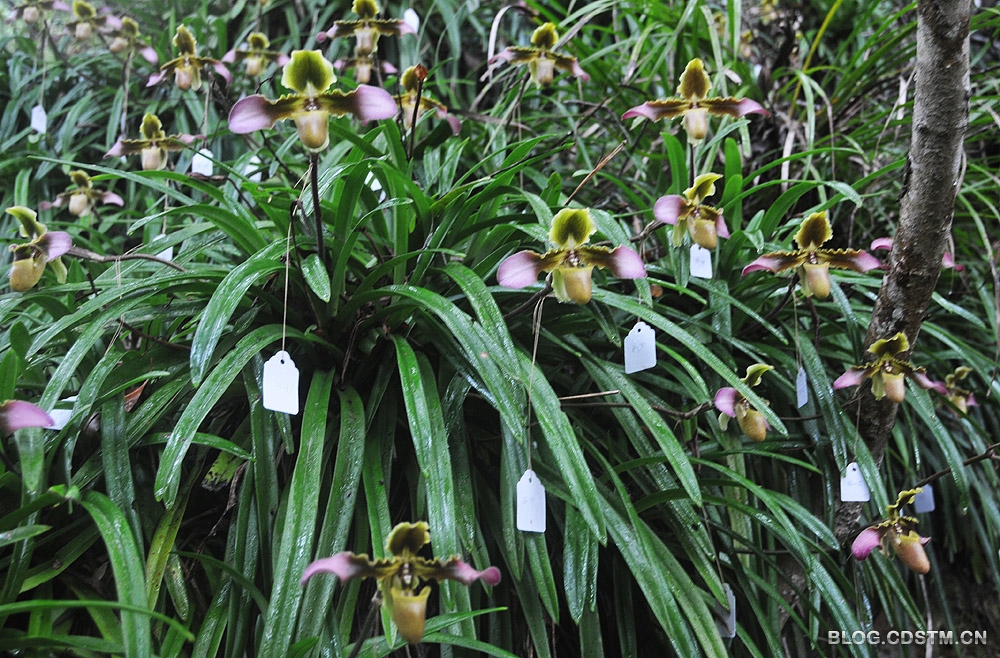5月20日中午,我和擅长拍花的吴奈先生一起,到有“世界天坑之都 ”美誉的广西乐业县花坪镇去寻找其芳踪。天公不作美,雨飘然而下。在山林里行进,不但衣服被淋湿了,相机也淋湿了,但这阻止不了我们前进的步伐。在林场职工的指引下,我们穿过用木条架起的便道,到达野生带叶兜兰成片生长的地方。因为要迎接世界兰花研讨会的各国专家的到来(5月26日在南宁开世界兰花研讨会,会后组织去乐业参观),那里的野生带叶兜兰都挂上了“名片”。