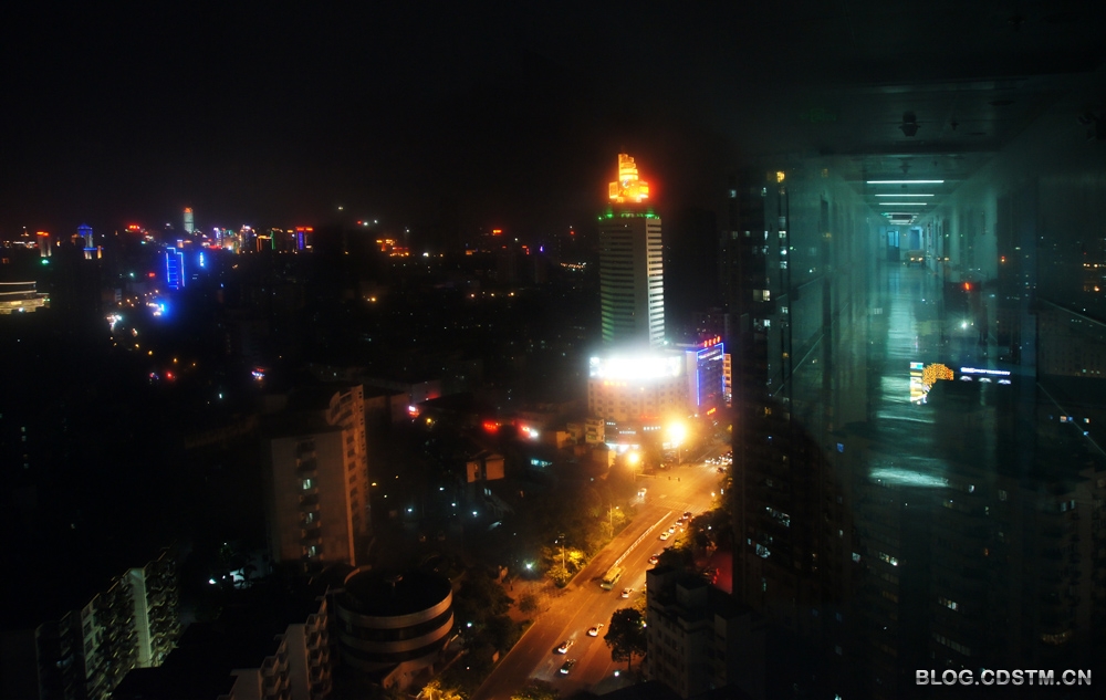 7月28日晚到广西壮族自治区人民医院陪护,在22楼走廊东面可看到半个南宁市区的夜景,于是掏出相机用手持夜景模式拍照。结果把投影到窗上的医院走廊也收入镜中,出现1图2景的效果。