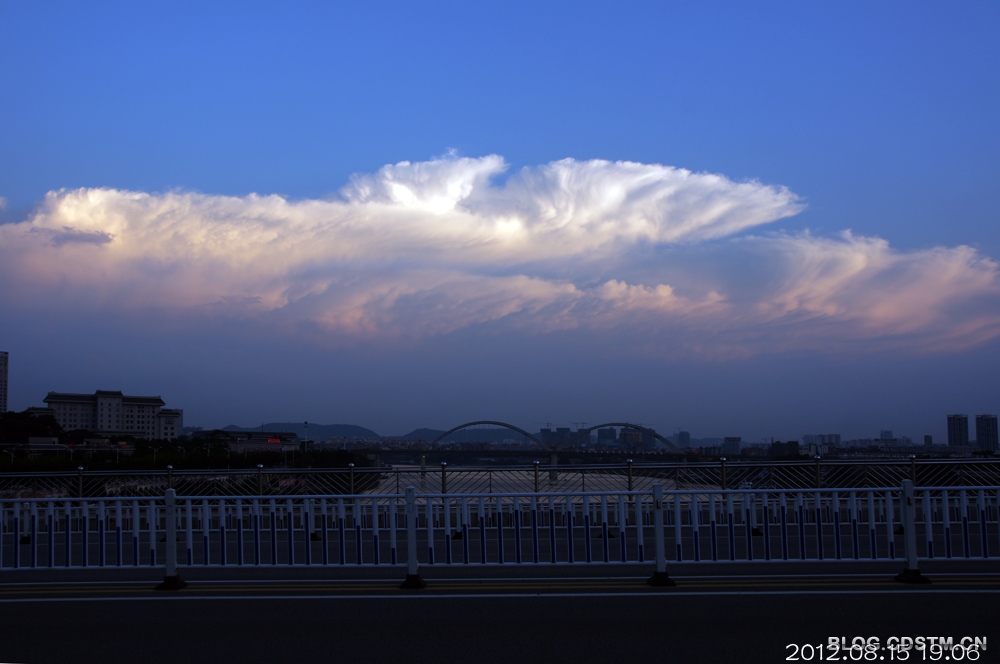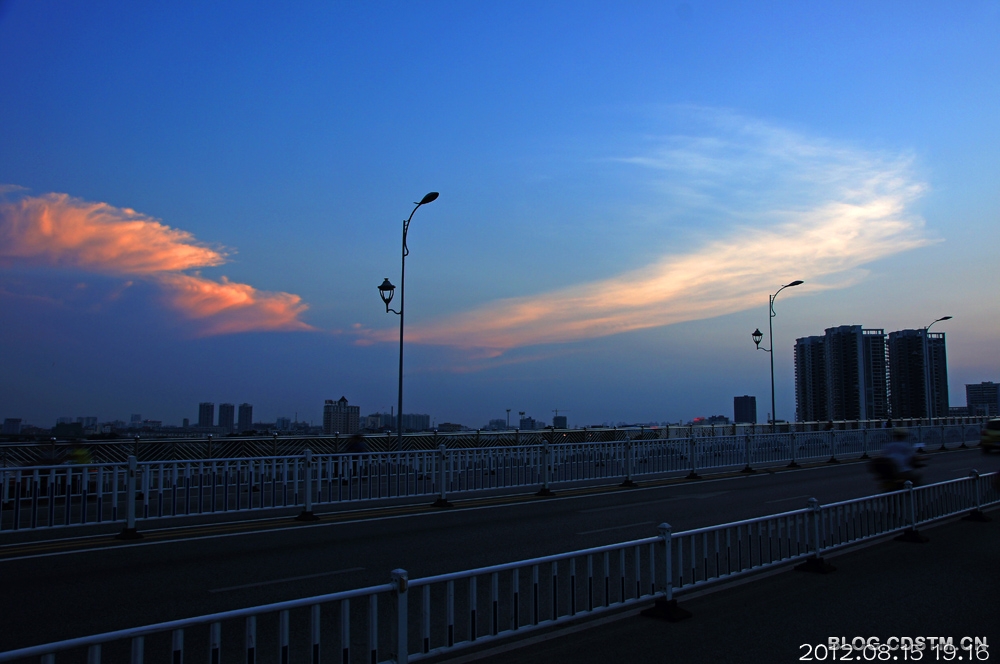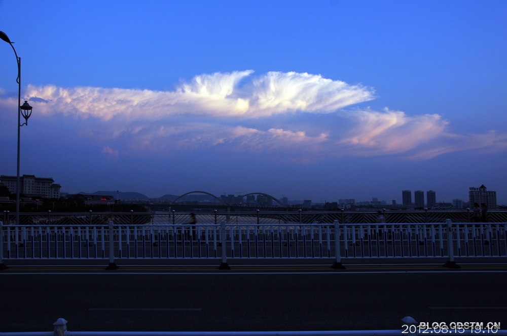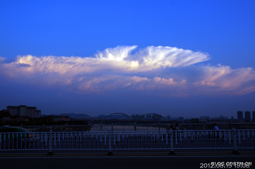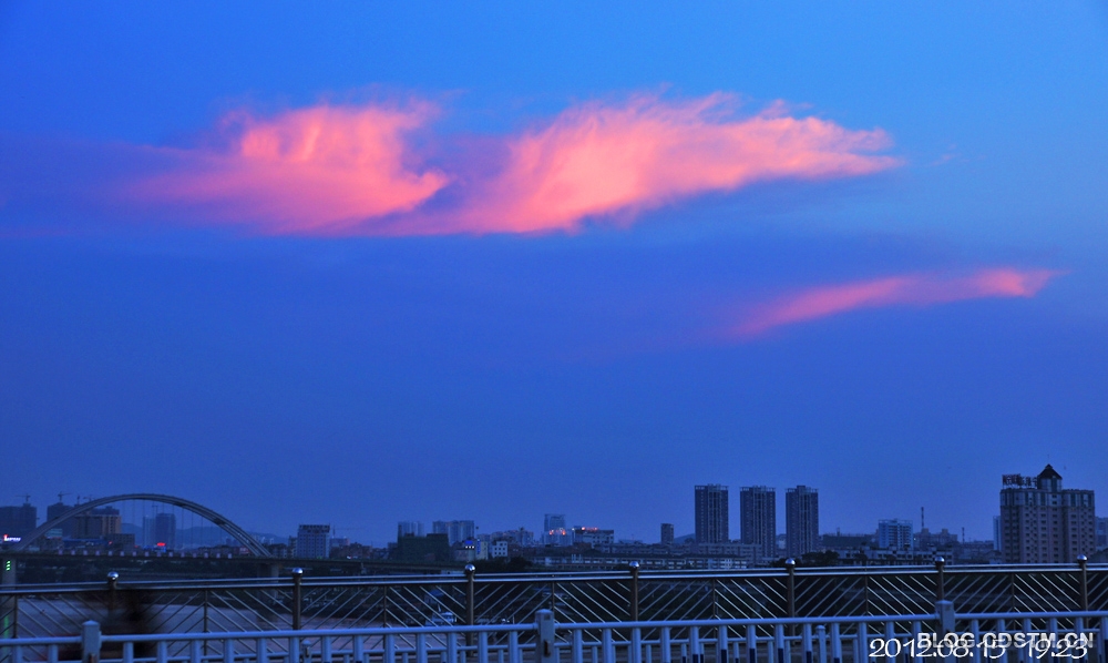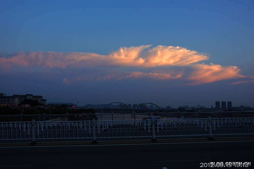 8月15日傍晚我到江边散步时发现东方有朵向南延伸、很有观赏性的白云,从18点57分开始,一直跟踪到19点23分云完全变红才收镜。晚霞的变化是缓慢的,不像朝霞那样瞬息万变。