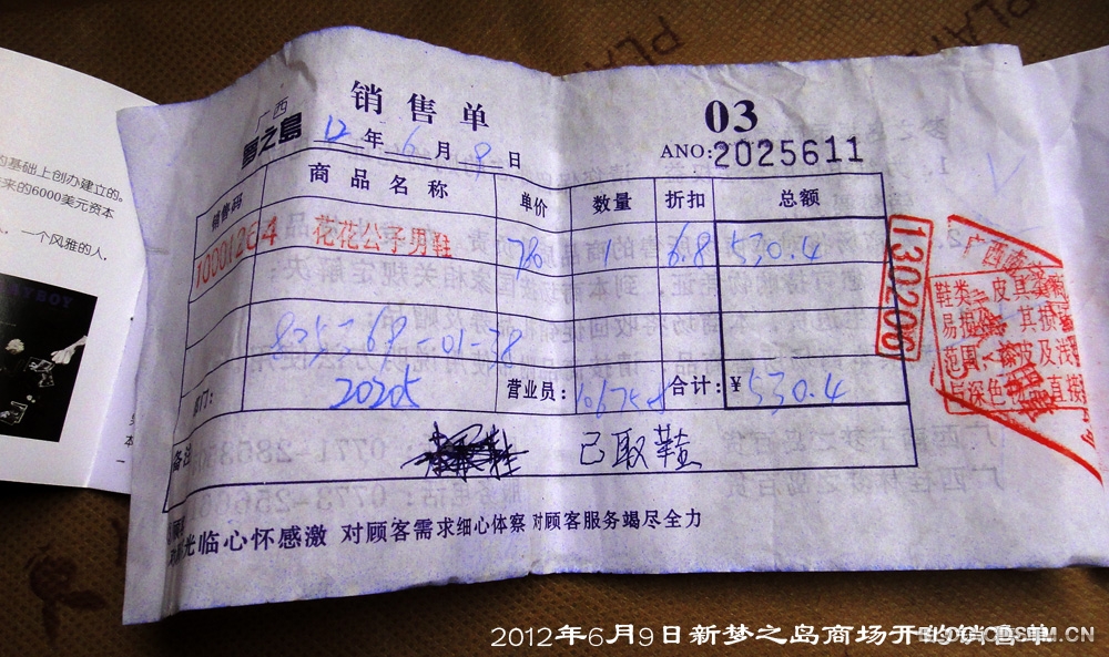 6月9日,我老伴在南宁新梦之岛商场买了双男装花花公子休闲鞋,标价780元,折后价530元。商家承诺3个月内出现质量问题可退货。