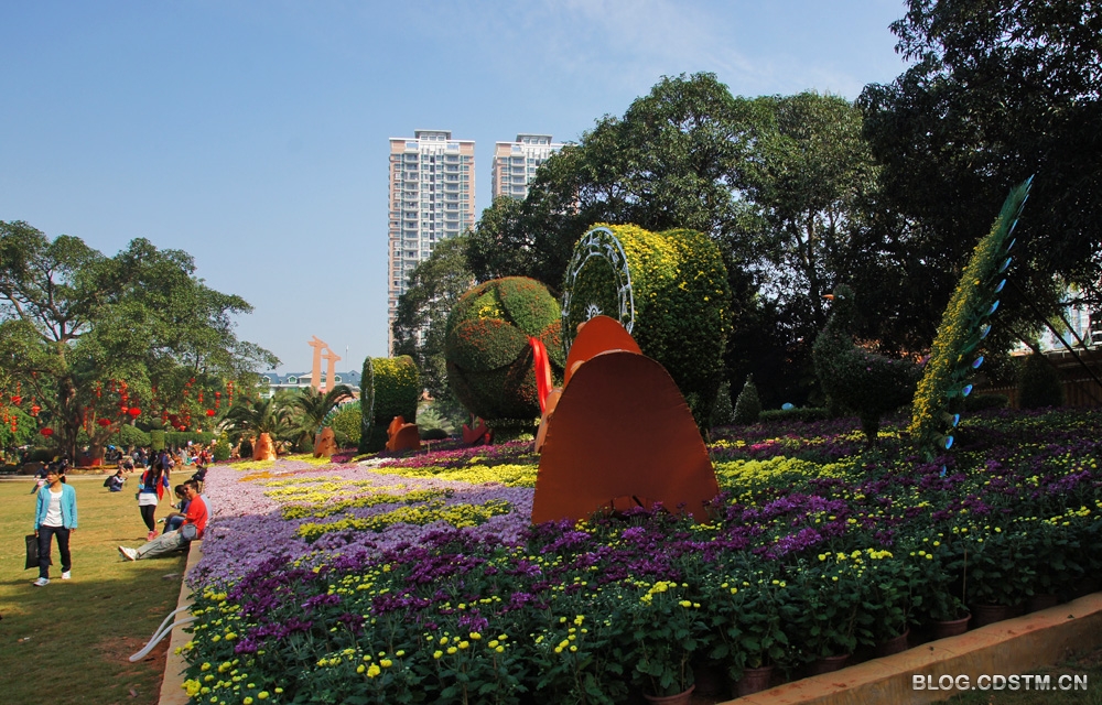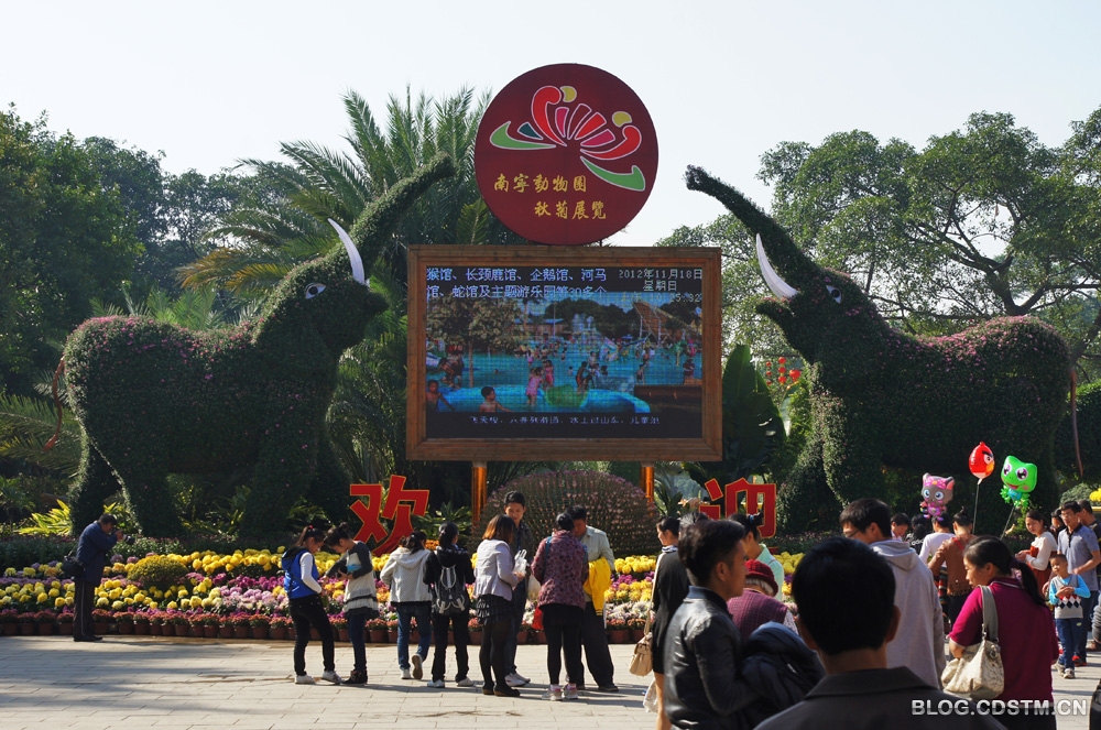 南宁市动物园举办的菊花文化节于11月18日上午开幕。数以10万计的菊花盆堆砌成各种动物模型。孔雀、大象、恐龙、龙凤、12生肖等造型制作得栩栩如生、惟妙惟肖,非常逼真、传神。最具震撼力的是60多米长的金色巨龙,在秋阳下闪闪发光,非常大气、壮观。