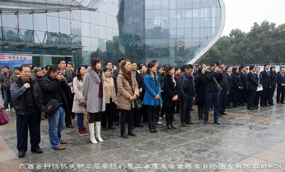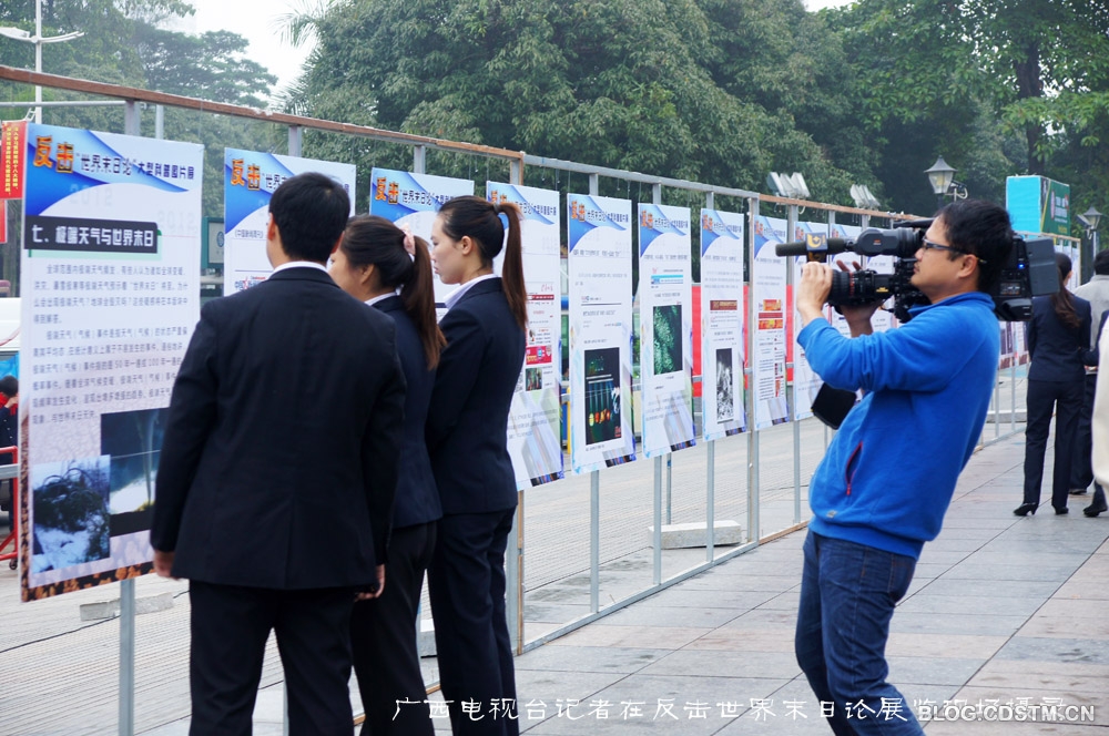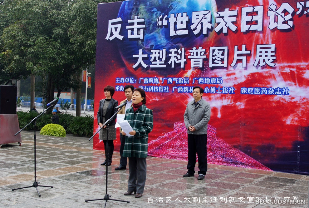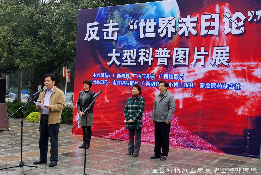 广西反击世界末日论大型科普图片展于2012年12月21日上午9点在广西科技馆广场举行。广西区科协副主席朱东主持开幕式,广西壮族自治区人大副主任刘新文出席开幕式并宣布展览开幕。广西区科协机关和二层单位的员工出席开幕式。图片展由广西区科协、广西气象局和广西地震局主办,南方科技报、广西科技馆、小博士报和家庭医药杂志社承办。2012年12月18日布置任务,仅用2天时间就完成103块展板的制作和布展。