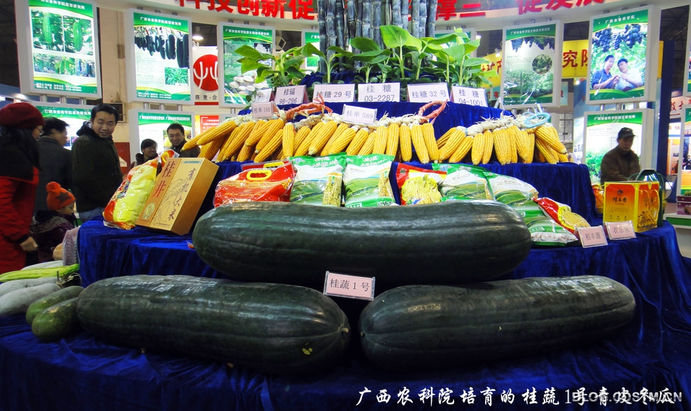 这次活动周展出的成果主要是农业方面,如广西农科院培育的优质玉米、甘蔗、冬瓜,蚕业所的彩色蚕茧(广西是我国最大的蚕茧基地),百色的无土栽培、乐业的铁皮石斛组培苗、贵港的紫红薯(一蔸收获110斤)等。工业的不多,但也有些亮点,如南宁的环保低碳车、桂林的无人机、柳州的轿车和百色的铝制品等。
