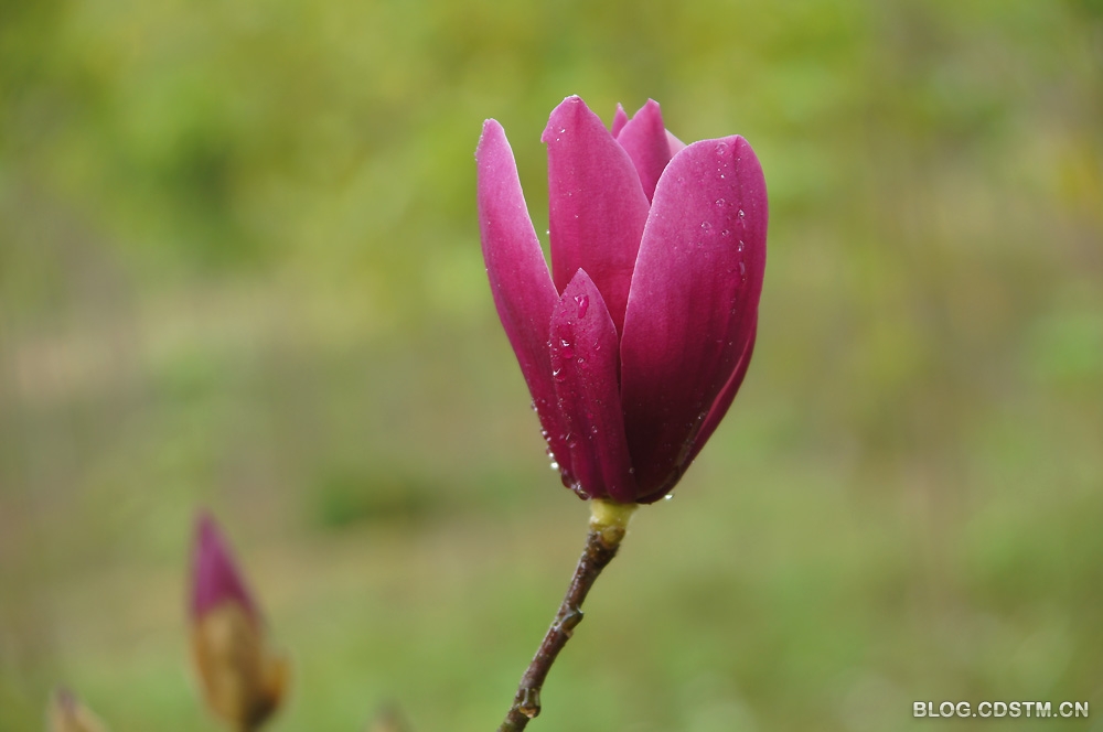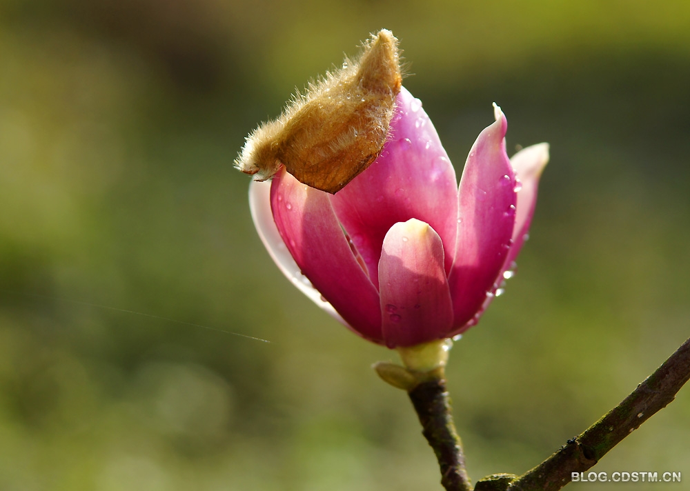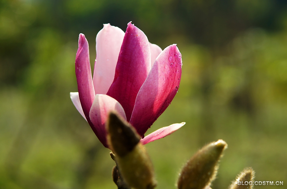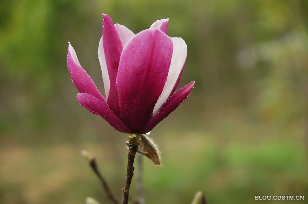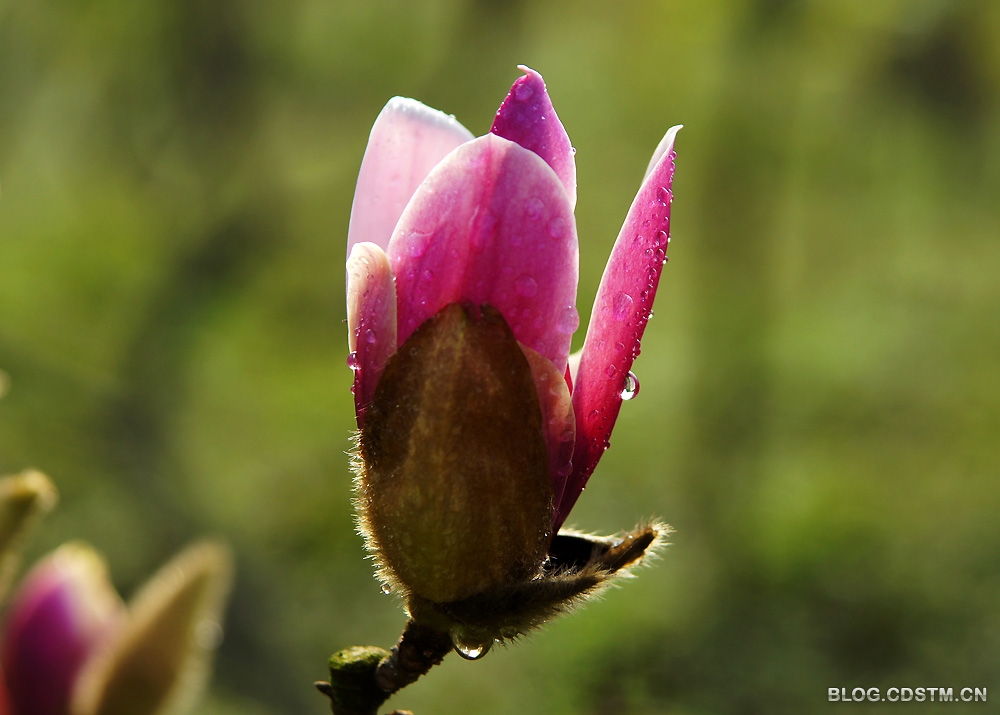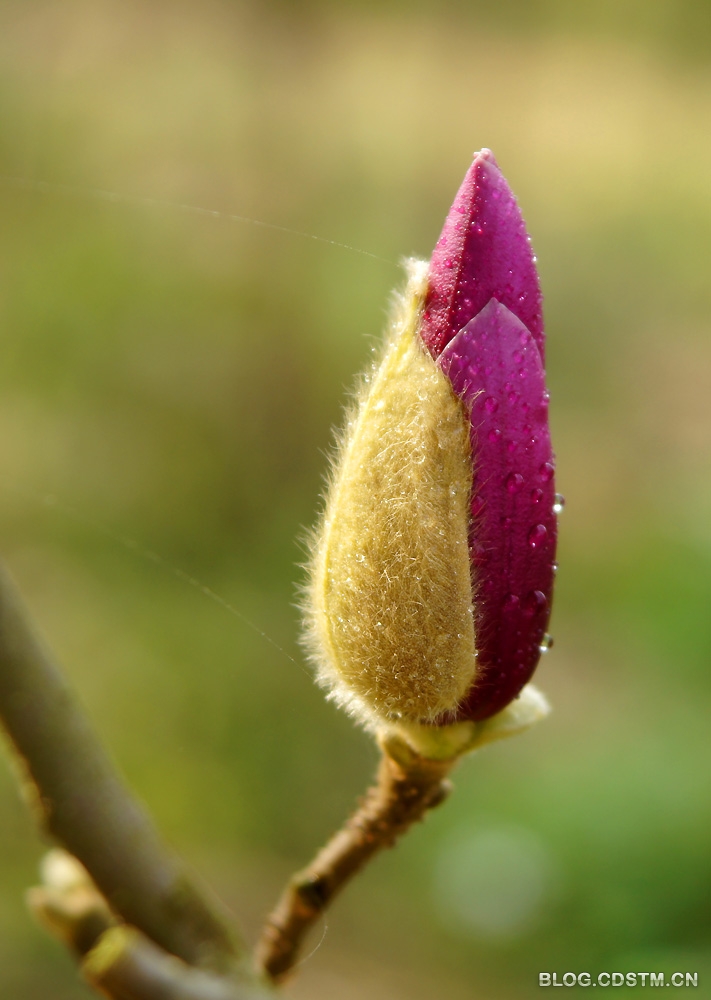 玉兰花开穿紫袍,  姐妹难辨是双胞。