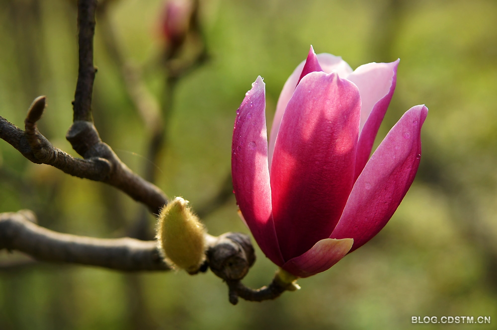 紫玉兰与二乔玉兰花型花色都一样,一般不易分辨,极易将二乔玉兰当作紫玉兰。有什么办法来区分这“孪生姐妹”吗?有的,主要是观察花与叶。先开花后出叶者是二乔玉兰,先出叶或花叶同时出现者为紫玉兰。以下几句,可供参考。
