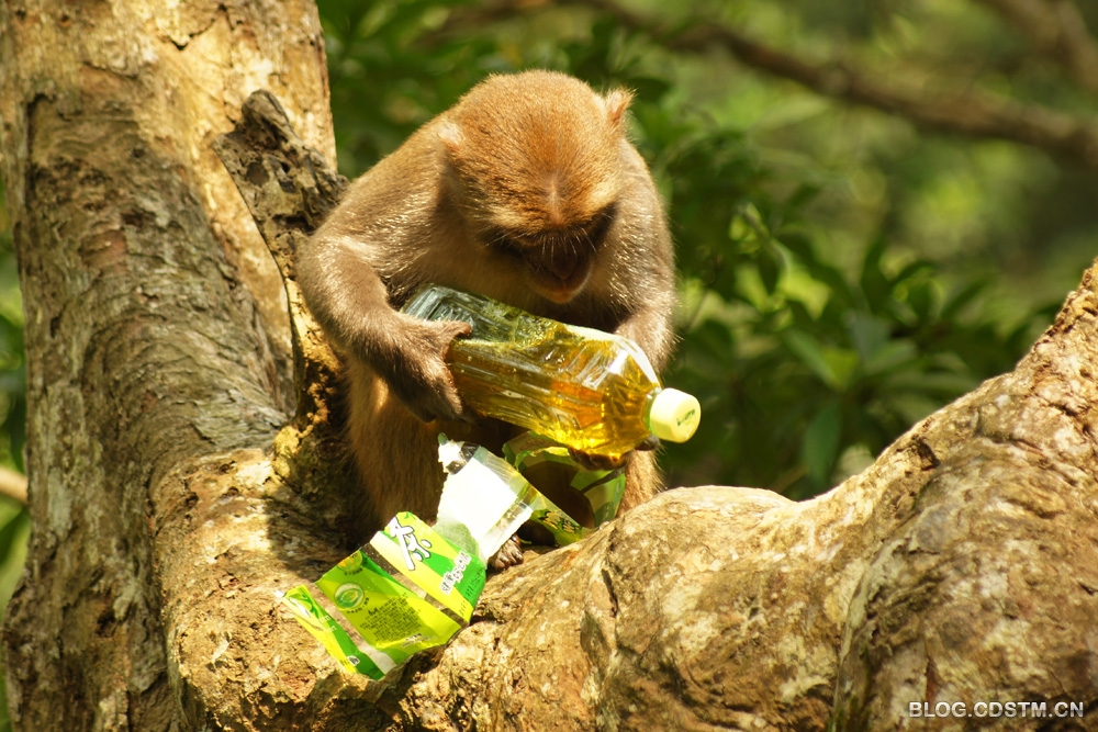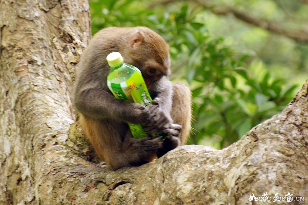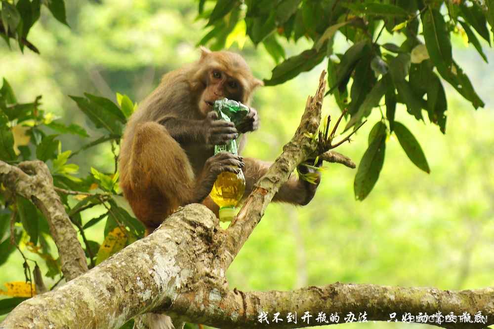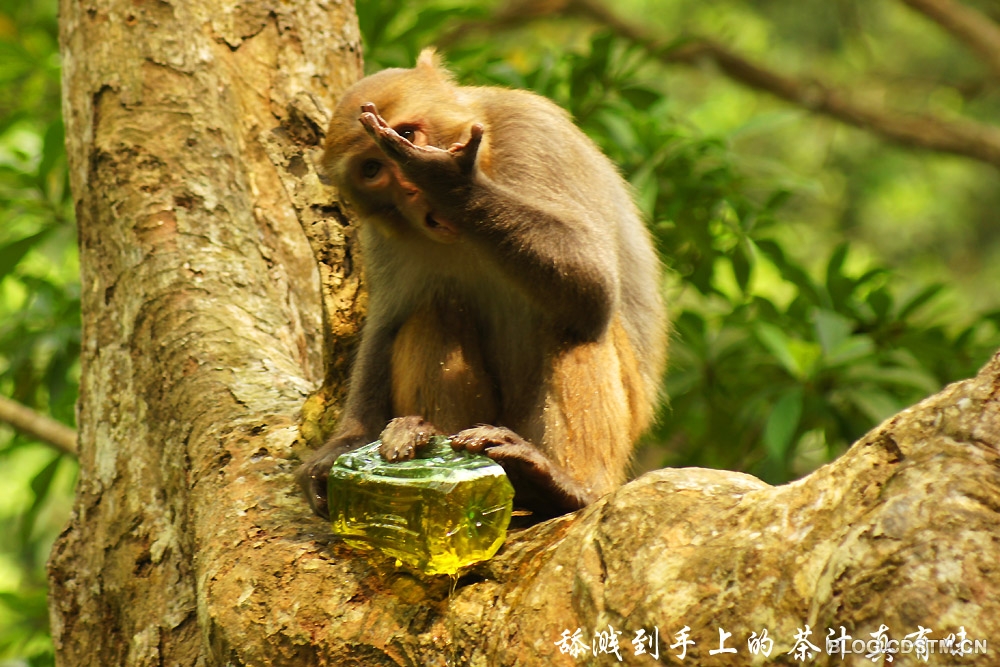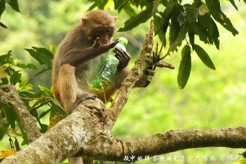 猴子的智商如何,我不知道。3月23日中午,我在广西隆安县龙虎山观猴时,发现一个有趣的现象—— 一只猴子面对一个冰绿茶瓶子,显得无计可施,无从下手,急得团团转。它先撕开瓶子的商标和说明书,左看右看,仍不知如何才能喝到瓶中的茶水。情急之下,它便咬着瓶体,瓶子裂开后,茶水飞溅而出。这时,猴子竟不知在裂口处喝茶水,而是频频舔被茶水溅中的手掌,直到这瓶冰绿茶漏尽,它也喝不到,只能舔舔手尝尝味道。