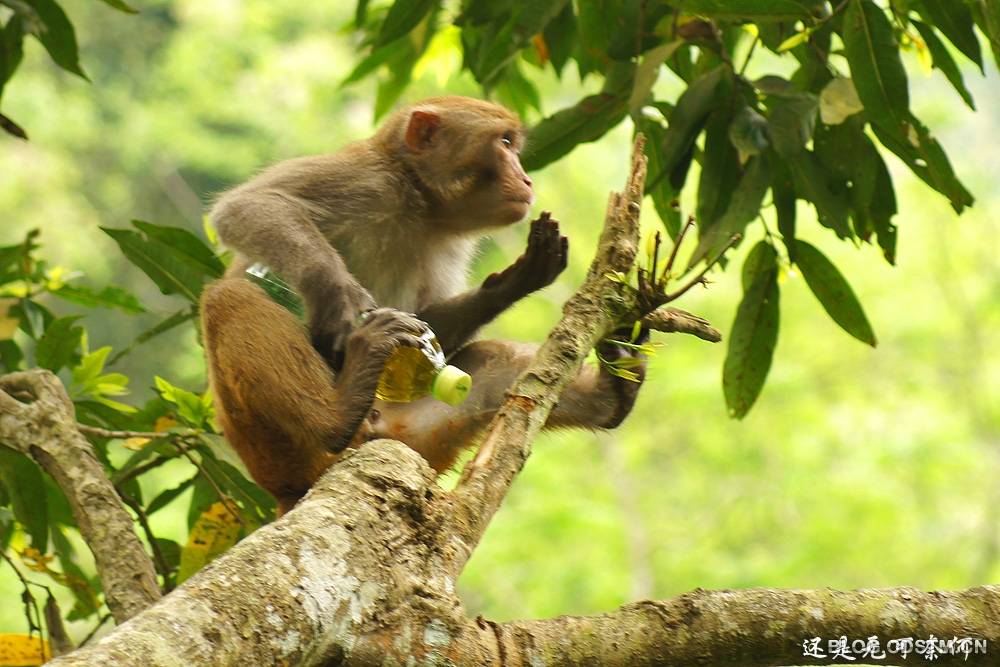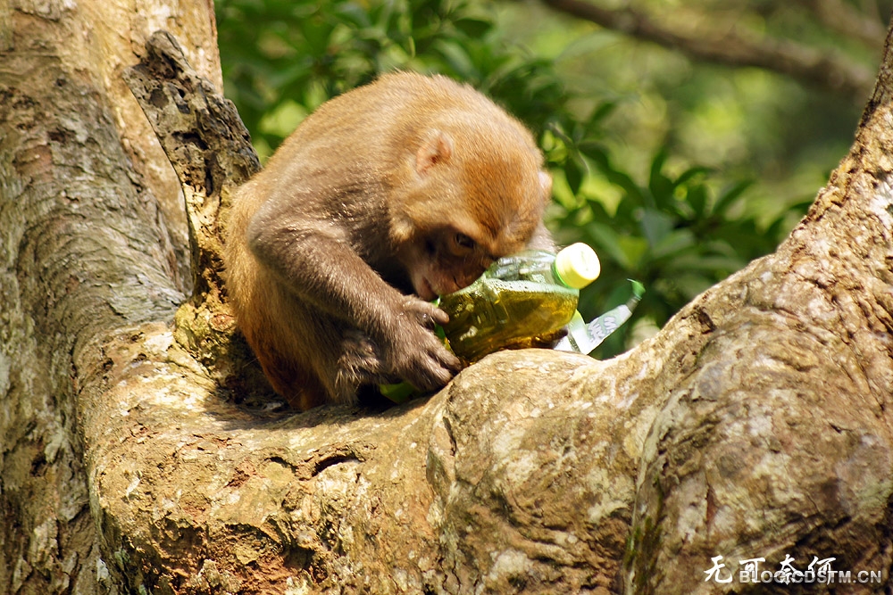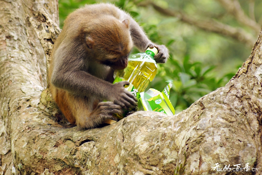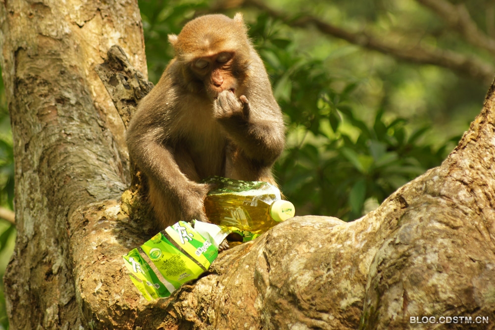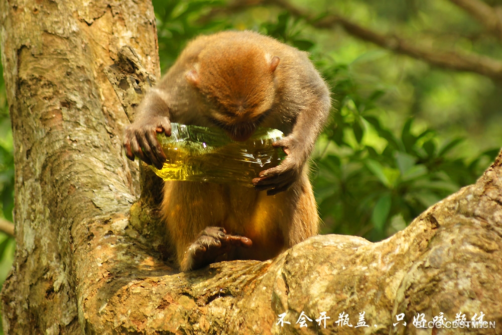 猴子的智商如何,我不知道。3月23日中午,我在广西隆安县龙虎山观猴时,发现一个有趣的现象—— 一只猴子面对一个冰绿茶瓶子,显得无计可施,无从下手,急得团团转。它先撕开瓶子的商标和说明书,左看右看,仍不知如何才能喝到瓶中的茶水。情急之下,它便咬着瓶体,瓶子裂开后,茶水飞溅而出。这时,猴子竟不知在裂口处喝茶水,而是频频舔被茶水溅中的手掌,直到这瓶冰绿茶漏尽,它也喝不到,只能舔舔手尝尝味道。