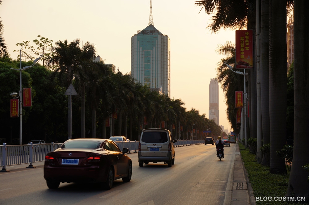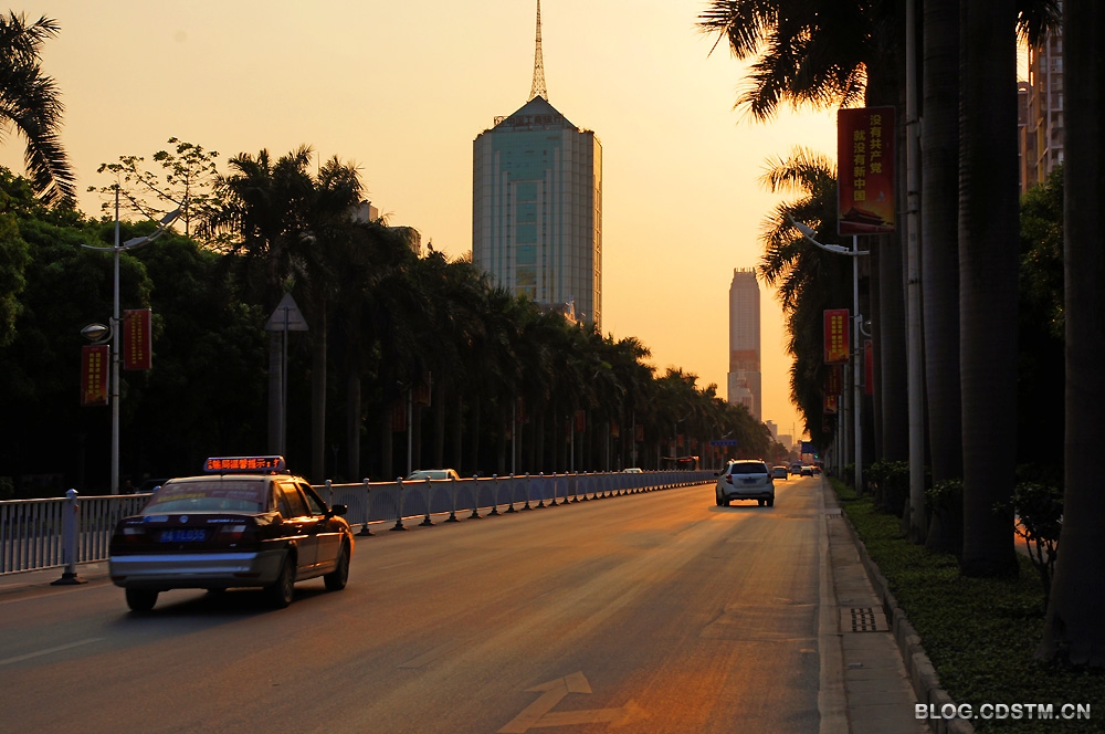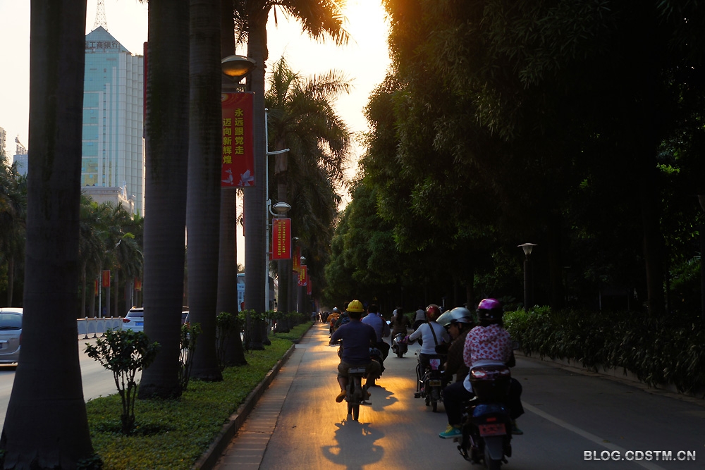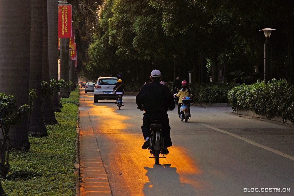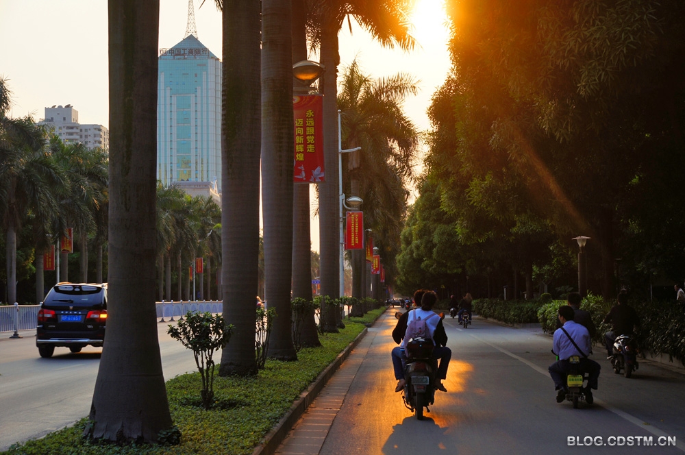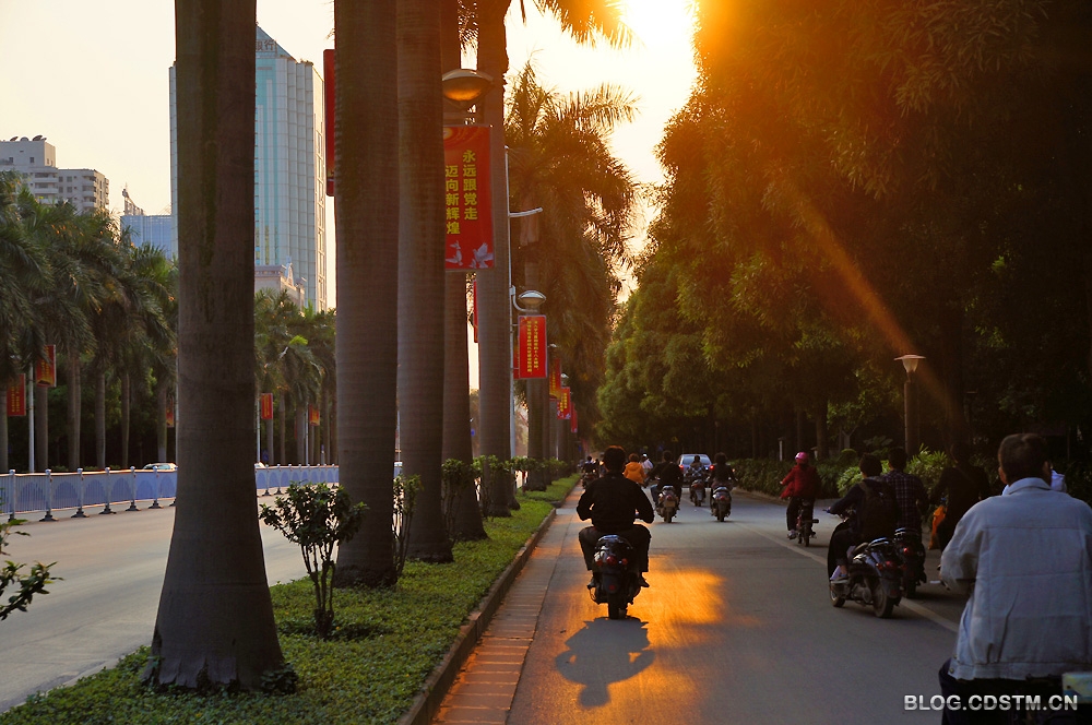 3月6日下午,南宁出现久违的阳光。6点多钟,被称为南宁市名片之一的民族大道(该大道由低、中、高三层植物构成绿色的屏障,依次为螃蜞菊、朱槿、棕竹、荫生植物、大王椰、扁桃、榕树、洋紫荆、木 棉等),金色的夕光透过绿树的缝隙,洒在行迹匆匆的行人身上,路面似被抹上一层金,给人以壮美、充满活力之感。