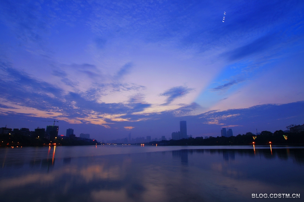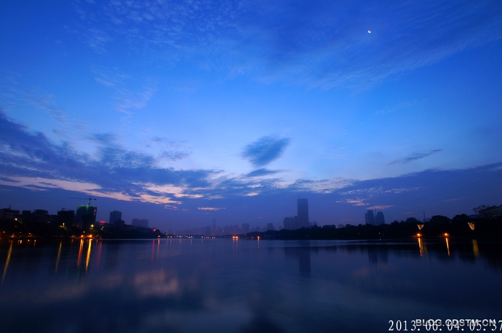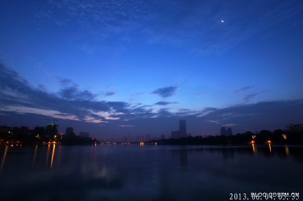 6月 4日拂晓,我照例骑上双轮“宝马” 赶去南湖恭候朝霞。到南湖“中央台”时是5点34分,当时一弯残月高挂在碧空中。我迅速安好脚架,装上11~18毫米超广镜头的相机 ,焦距固定在13毫米处,感光度100,光圈固定在11, 速度分别为8秒、8秒、6秒、5秒、4秒、5秒和2秒。从5点35分开拍,到5点45分结束,大体每隔1分钟拍1张,先后拍了7张(其中第2张和最后1张因有云挡住残月,分别隔2分钟和3分钟)。然后,将这7张在同一地点、同一焦段、同一光圈拍的图片叠加起来,就得到7个月亮爬上来的效果图(见题图)。