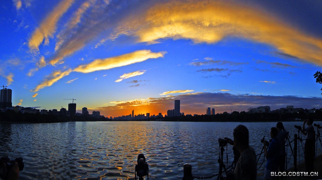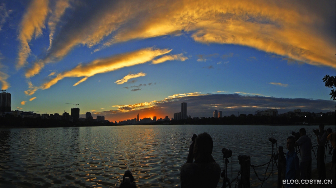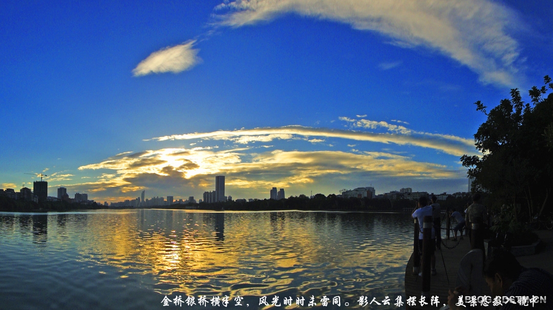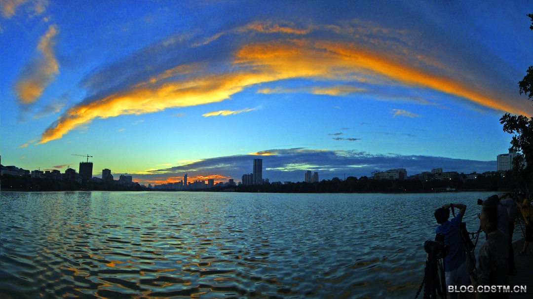2013年7月2日清晨,在热带风暴“温比亚”到达之前,南宁出现今年以来最奇特、最漂亮的朝霞。说其奇特,是因为虹状的朝霞横跨半空,先呈金黄色,不久,随着太阳的升起,阳光的强烈而变为银色;说其漂亮,是因为碧空如洗,霞光夺目。很多摄影人竞相拍下这难得一见的霞光。正是——
