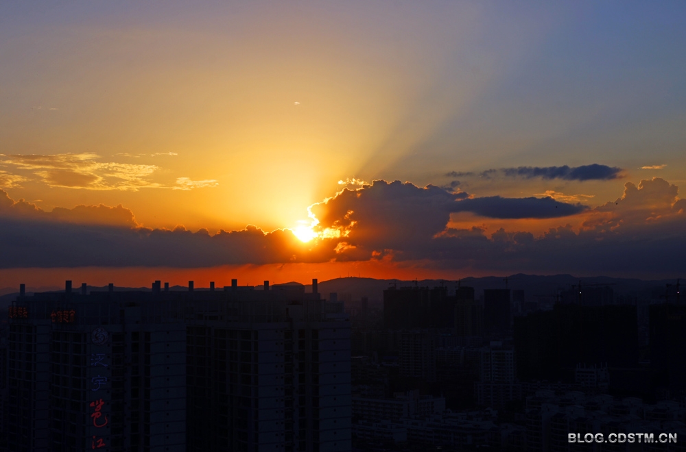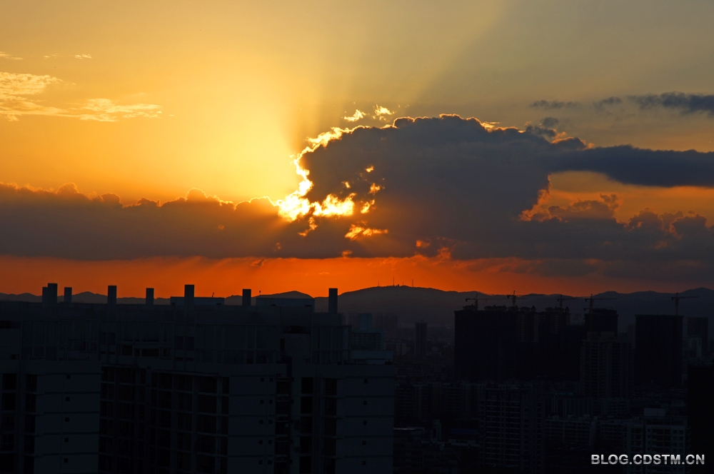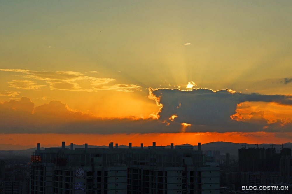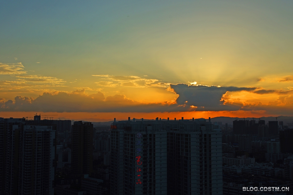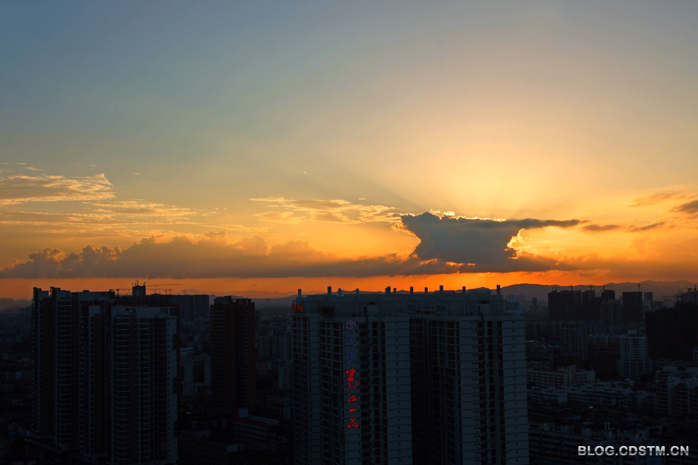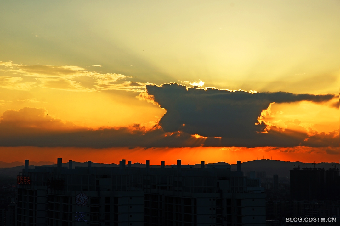 2013年7月4日傍晚。雨后的南宁云由白变黄再变黑,19点15分左右,一团黑云被夕阳冲破并镶上金边,像一头藏牛在天上狂奔......丁达尔效应产生的射光,像利剑直指长空——