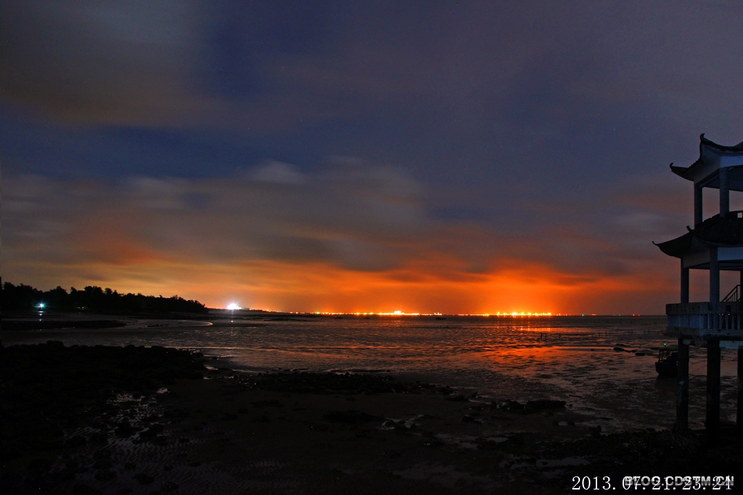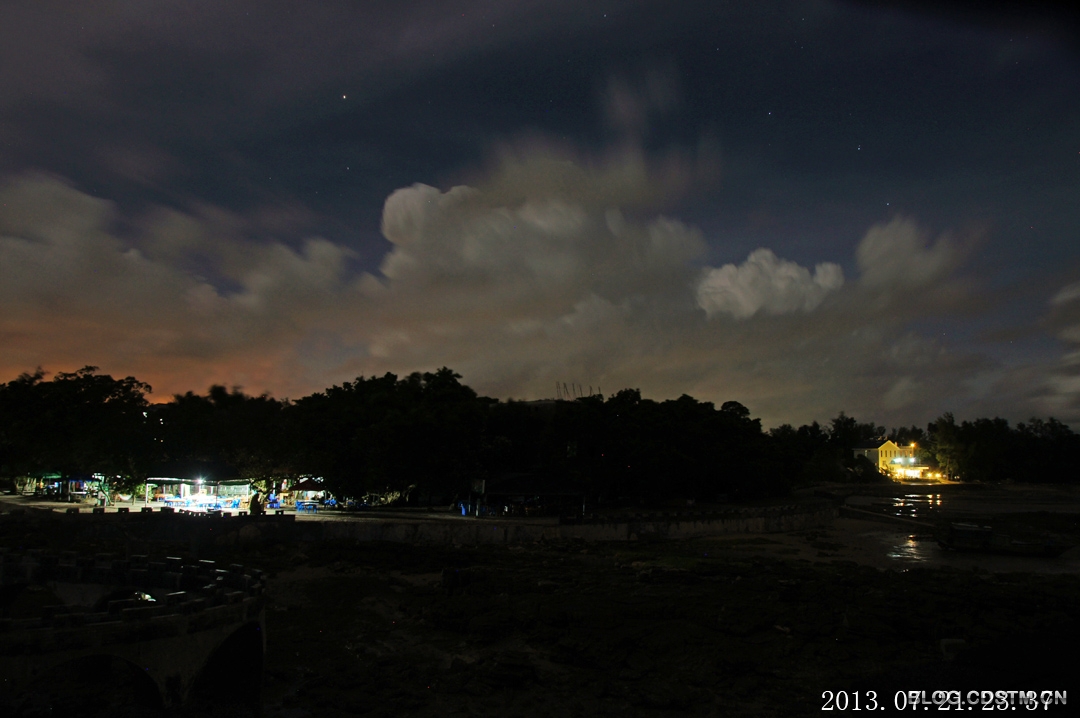2013-07-25 11:35:58 7月21日下午7点左右,参加地平线网在防城港月亮湾的外拍活动后,我和老活宝、阿里郎君、三无闲人等摄友赶去簕山古渔村。由于路况不很清楚,车上又没装导航设备,跑了不少冤枉路,本来约半小时车程,花近2小时才到达。入住心伟客栈后,到邀月台边的餐馆用餐,味道很鲜,吃得很爽。