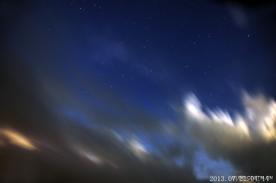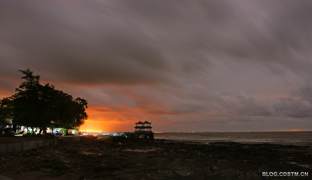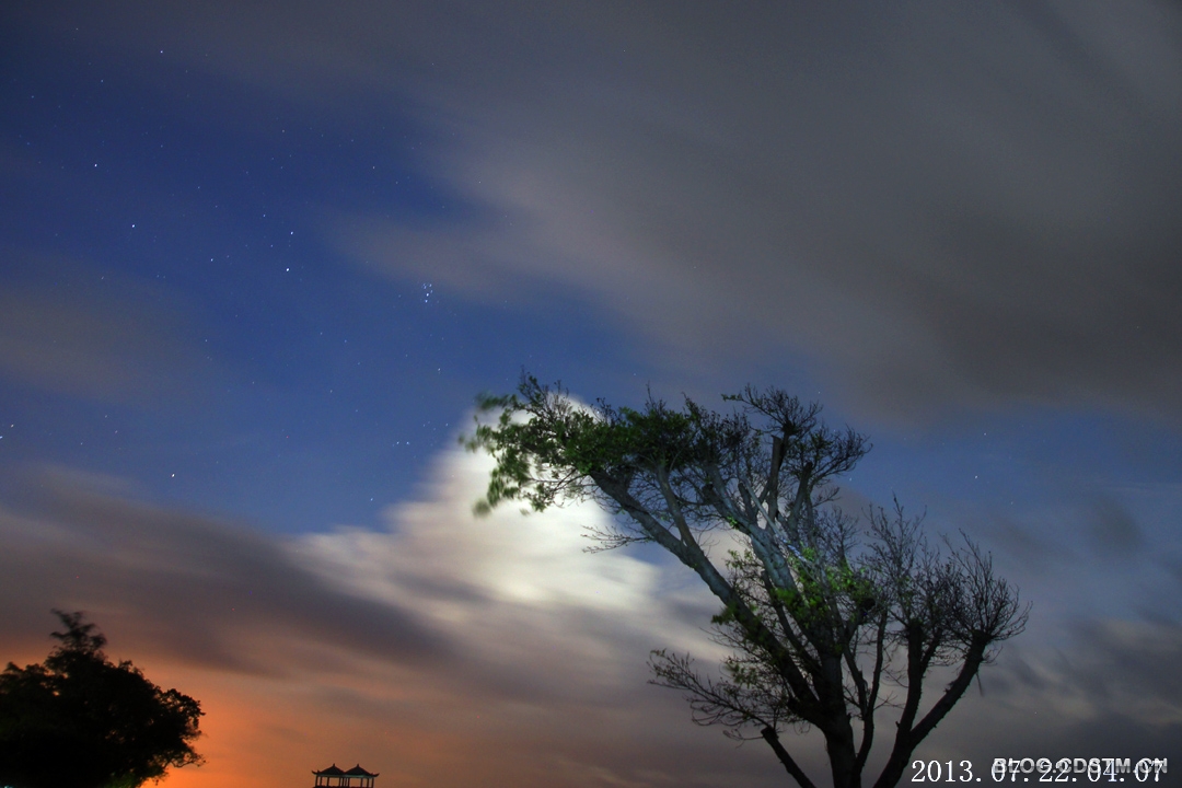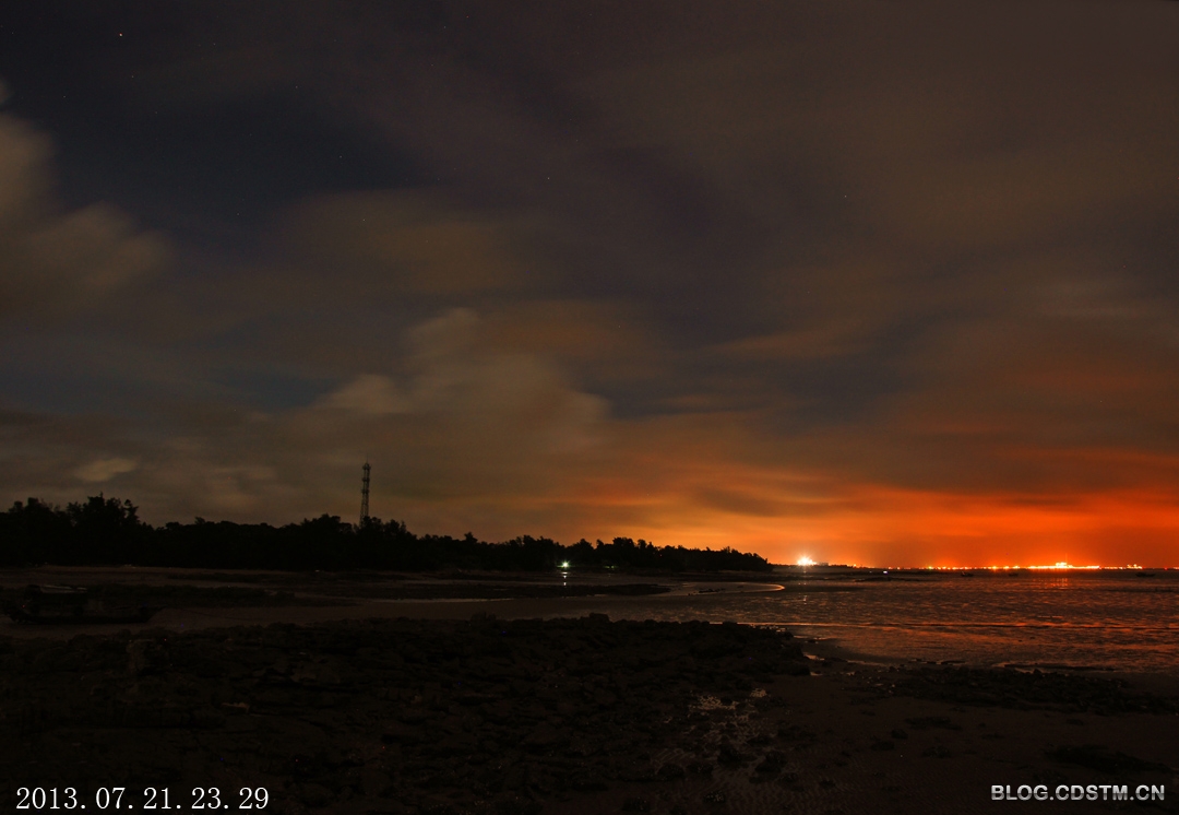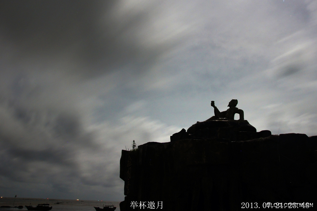 好不容易到簕山一趟,我不愿放过拍片的良机 ,当晚11点多钟仍和三无闲人到望海亭和邀月台去拍夜景。望海亭对面的钦州湾灯火通明,将夜空低处的云染成桔红色 ,别有一番景致;邀月台上,诗仙李白举杯邀月的雕像,随着月亮的时隐时现而显得时明时暗,有一种朦胧之美。12点钟左右回客栈休息,2点多钟三无闲人醒来,我问他是否看到满天星斗,他说星星很少,天上有云,于是继续睡觉。到了凌晨4点,我独自一人带上相机和脚架到海边转悠,想找到银河的踪迹。几只“执勤”的狗见到我,汪汪直叫,并在我身边转来转去,但并无要伤害我之意。于是,我与它们“和平共处”,它们叫它们的,我拍我的片。由于有月光和云较多,看不到银河,又一次与之失之交臂(5月中旬曾遇到此情况),很遗憾。