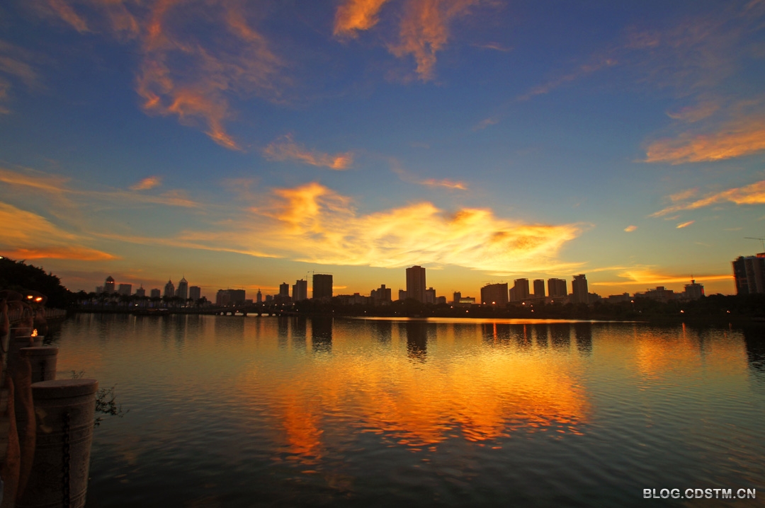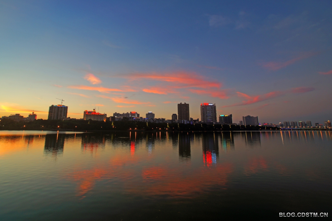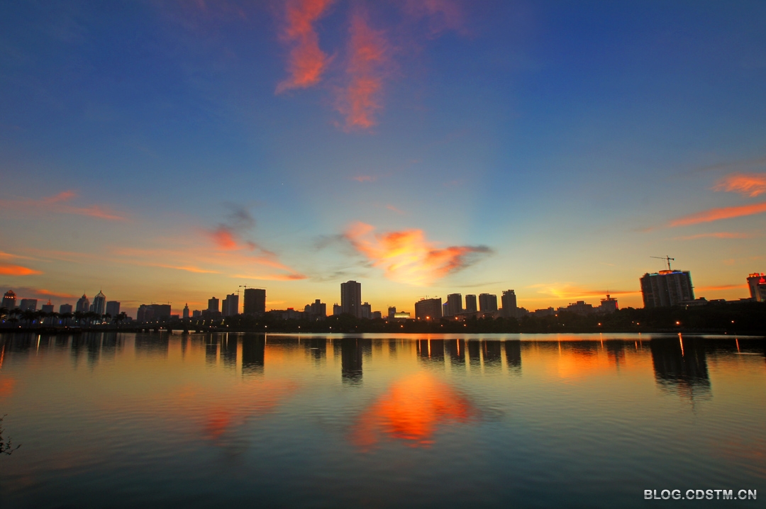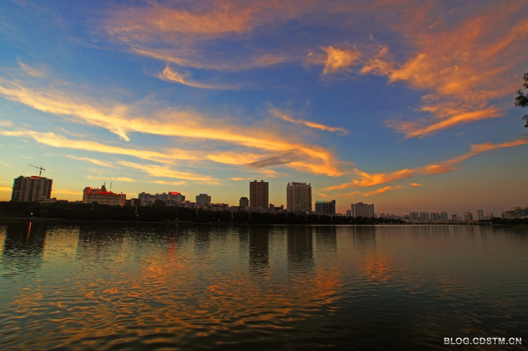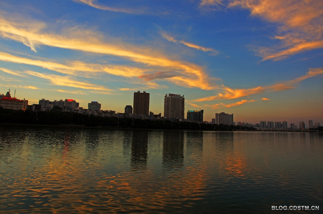 吃过晚饭,我骑上自行车到南湖。湖边汇聚很多摄影爱好者,长枪短炮齐刷刷对准备天边的云。19点30分,夕阳的余辉将白云抹成金黄色,随着时间的推移,霞色越来越亮丽,且染成红色,随后又出现直冲天庭的蓝色的光柱。这样的景观一年中也就几次,这一天竟然都遇上了,难怪摄友们惊呼——“太棒了”。