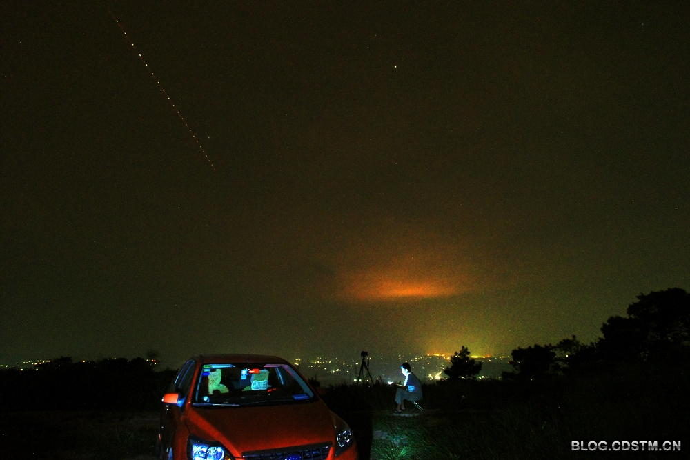 2013年8月1日晚,我和几位朋友跟他到离南宁市约80千米的横县去追踪银河,可惜天公不作美,云多,银河未现身。这是他在山上守候的情景。由于多种原因,片没拍好,遗憾。