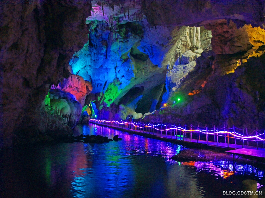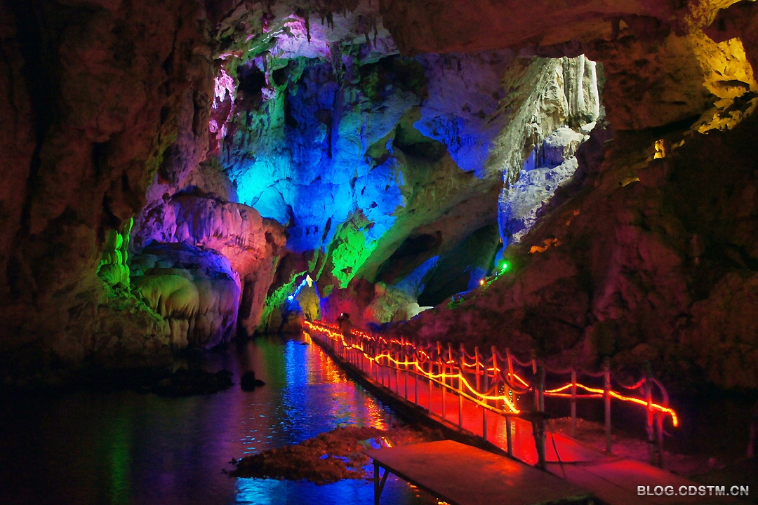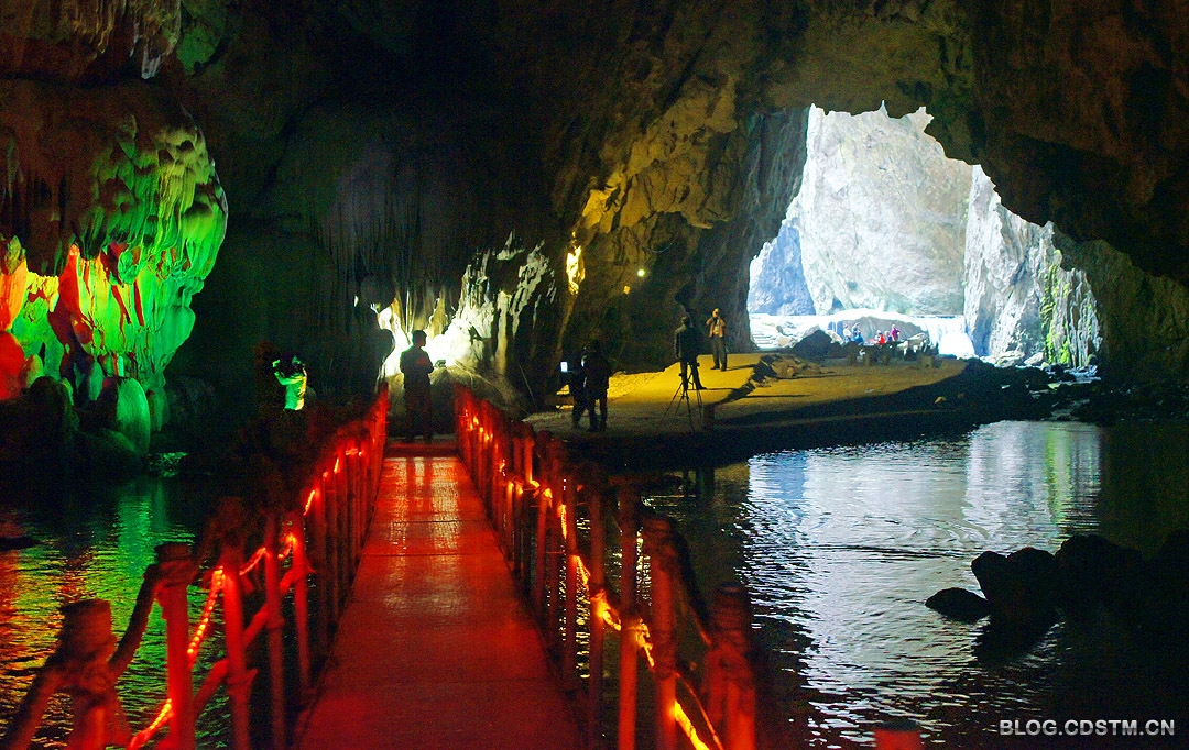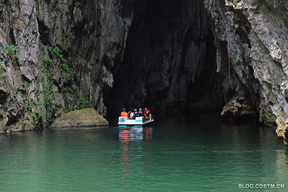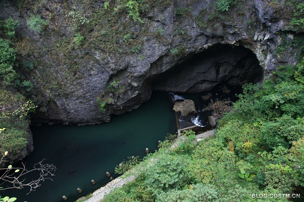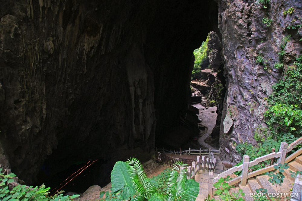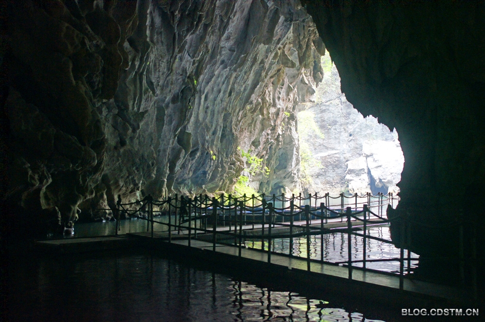 石门景点实际由2个山峰隔开的天坑组成,天坑底部有地下河,修有浮桥通到出口处。