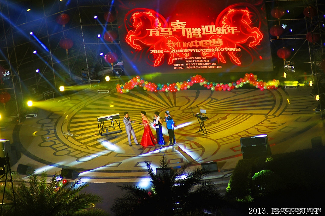 2013年12月31日晚,南宁电视台在有“南宁名片”之一的民歌湖(原民歌广场)举行辞旧迎新晚会,五光十色、变幻莫测的灯光,使本来就很漂亮的民歌湖披上梦幻般的色彩,令人陶醉。