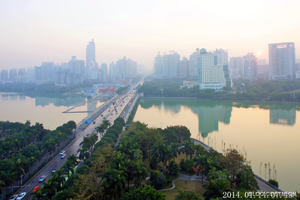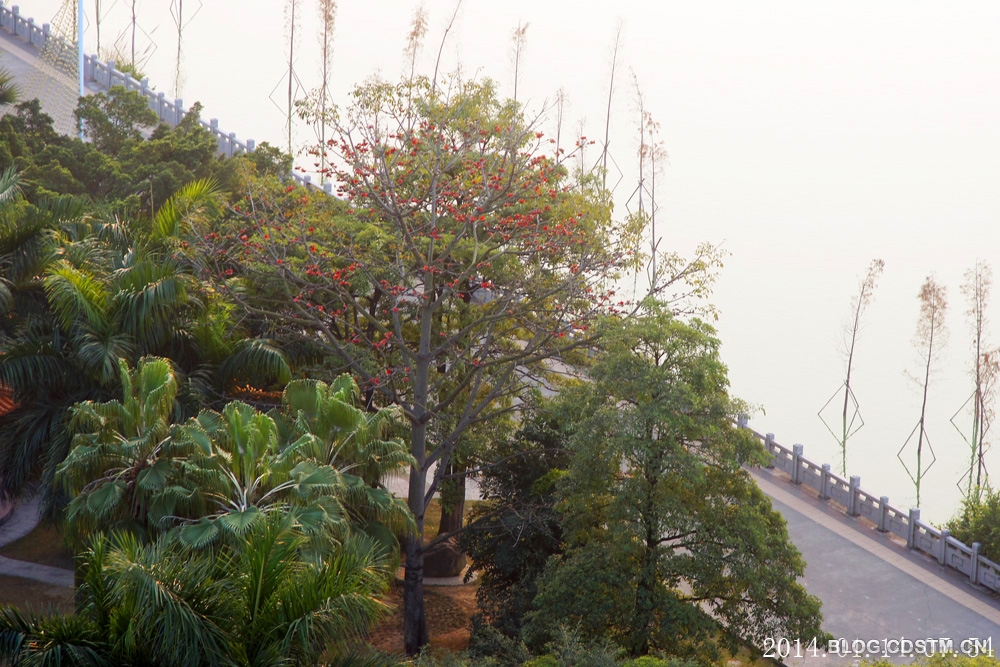 南宁的木棉花通常在每年3月开花,最早也得到2月中旬才绽蕾。2014很特别,还在三九天就开始含笑枝头了。1月14日清晨,我到南湖大桥西恭候朝霞,但朝霞找不到化妆品,不敢露面。无意中,发现有一株木棉枝头抹红,比往年提前1个多月报春。看来人类活动打乱了自然界的生物节律,才导致这种反常的情况出现。