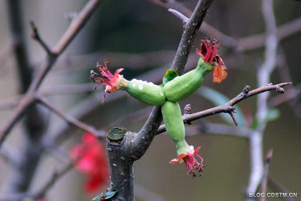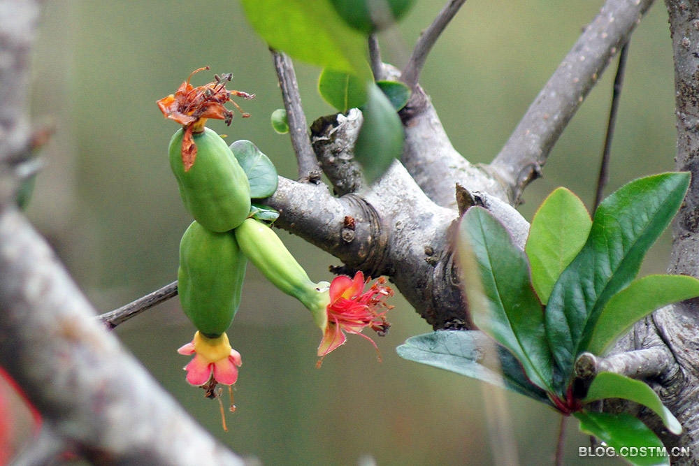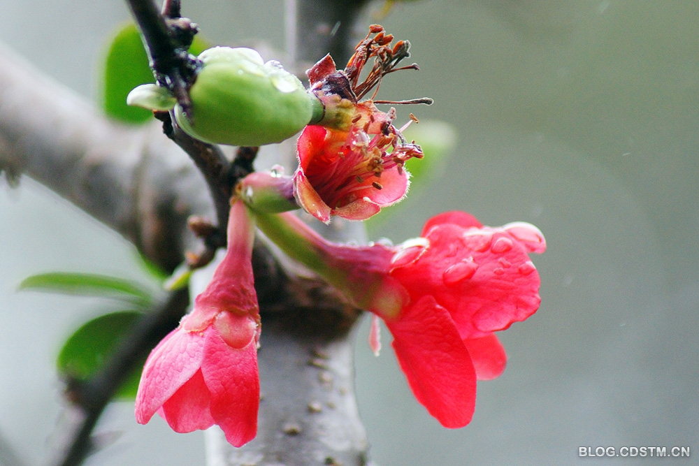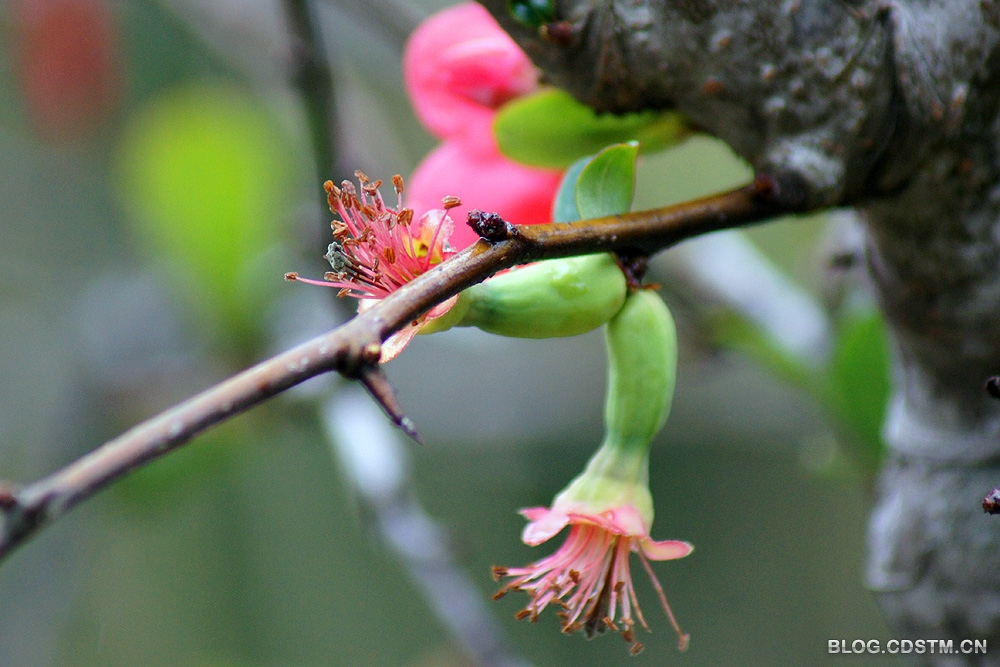 公园里种有些贴梗海棠。但往年只见开花不见结果,今年则例外,结了不少果实,且花果同在。果实有单个的,有成双的,也有多个共生的。