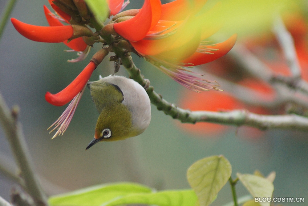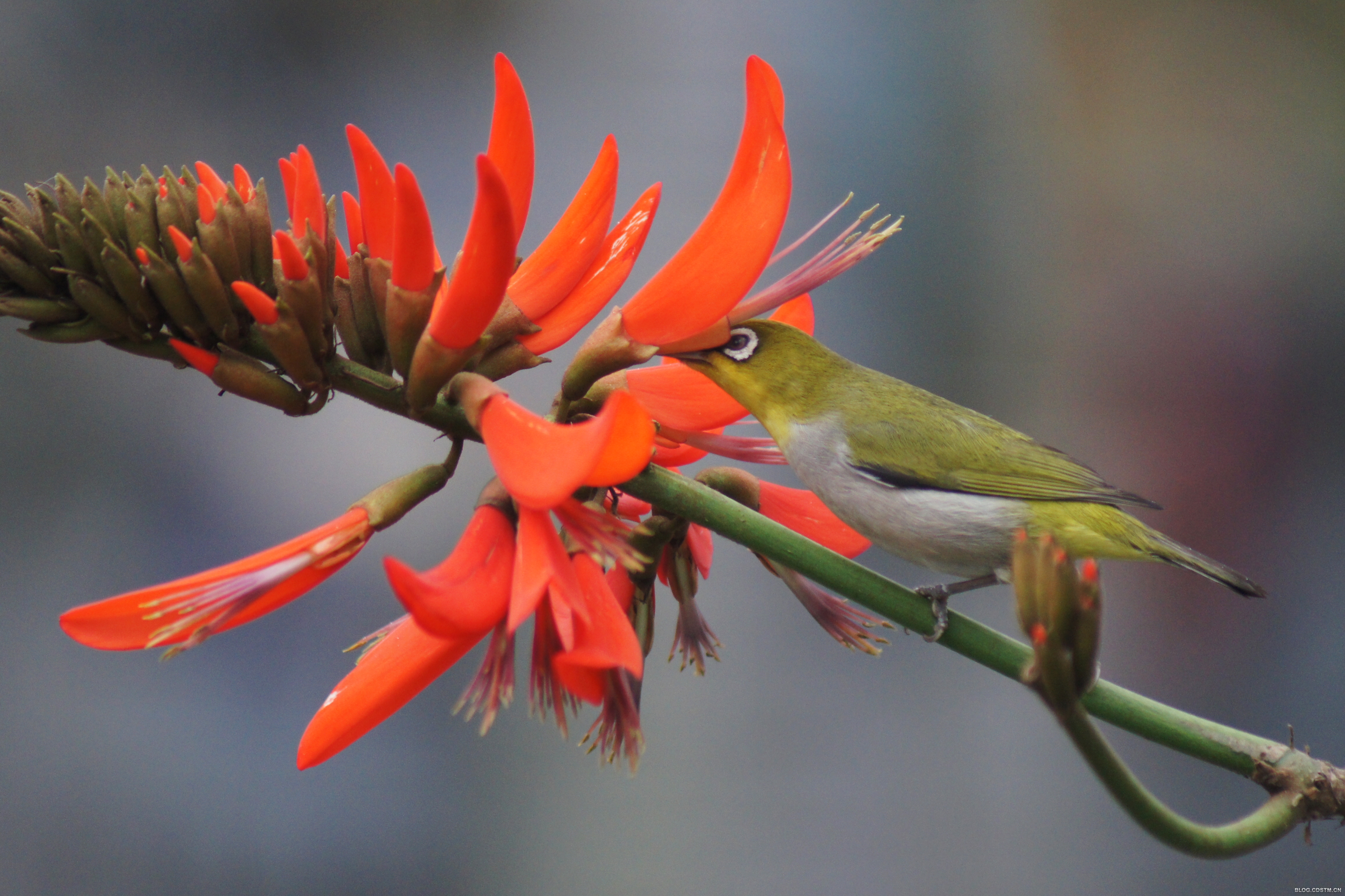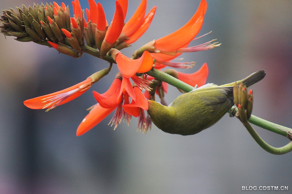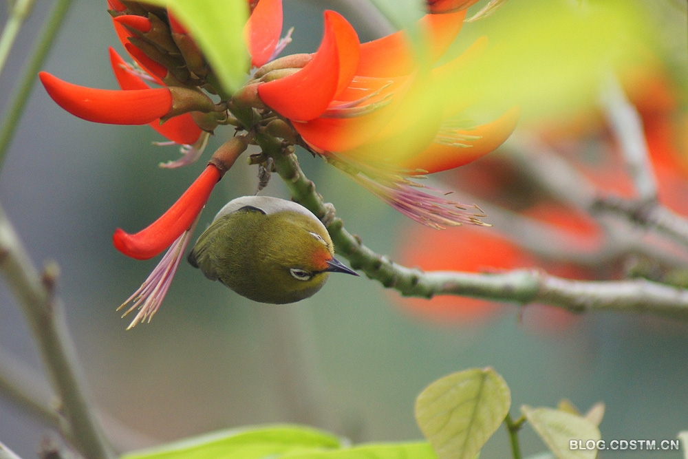 3月15日下午,南宁仍在飘着毛毛细雨。这样的天气已持续3个星期。喜欢摄影的人不愿呆在家里,我也一样,挎上相机,骑上双轮“宝马”,到人民公园拍绣眼戏鸡冠剌桐。