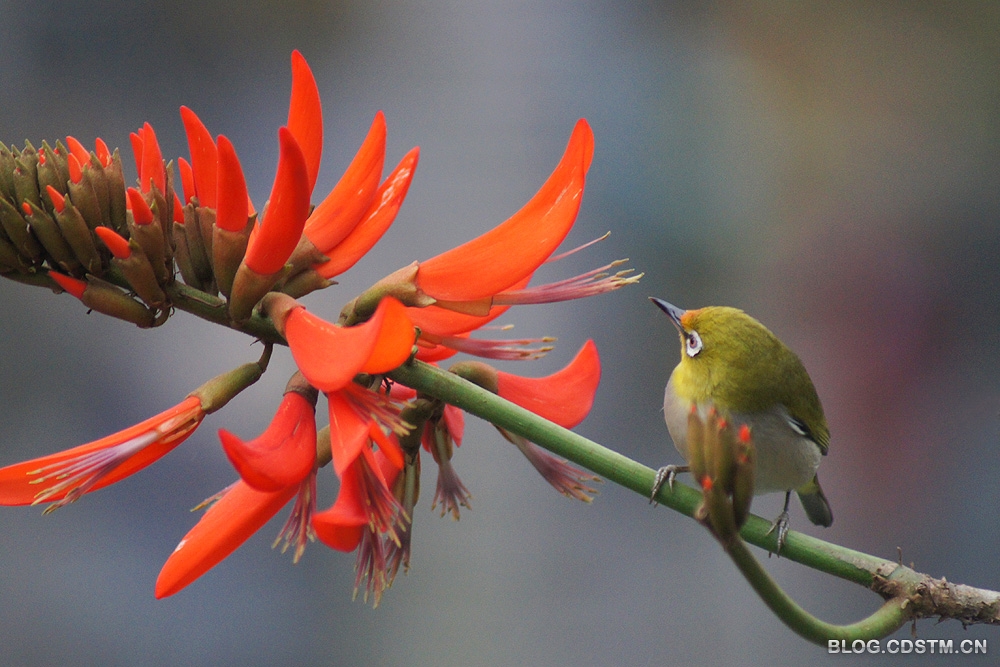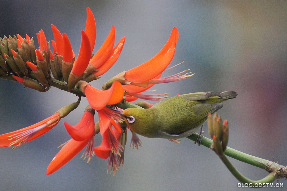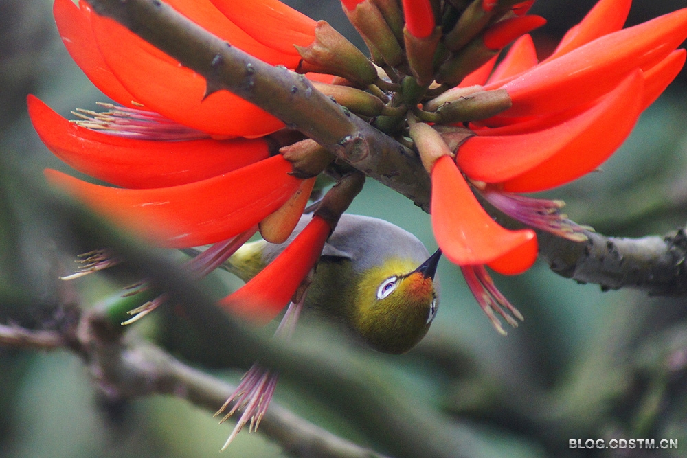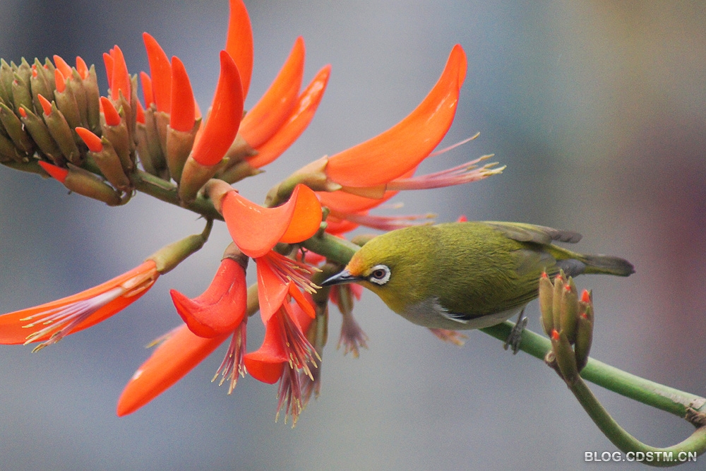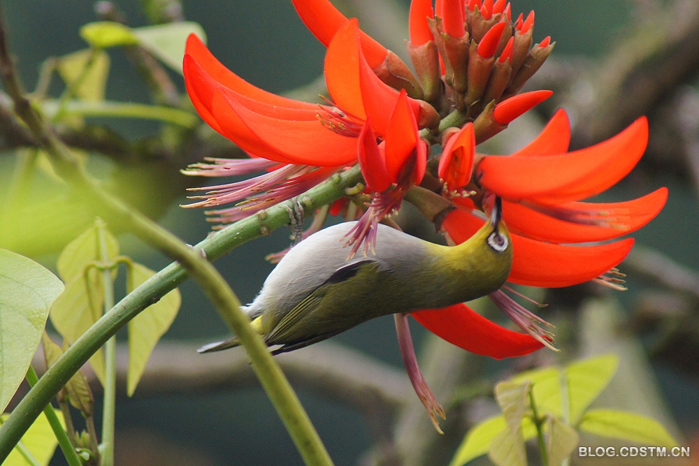 3月15日下午,南宁仍在飘着毛毛细雨。这样的天气已持续3个星期。喜欢摄影的人不愿呆在家里,我也一样,挎上相机,骑上双轮“宝马”,到人民公园拍绣眼戏鸡冠剌桐。