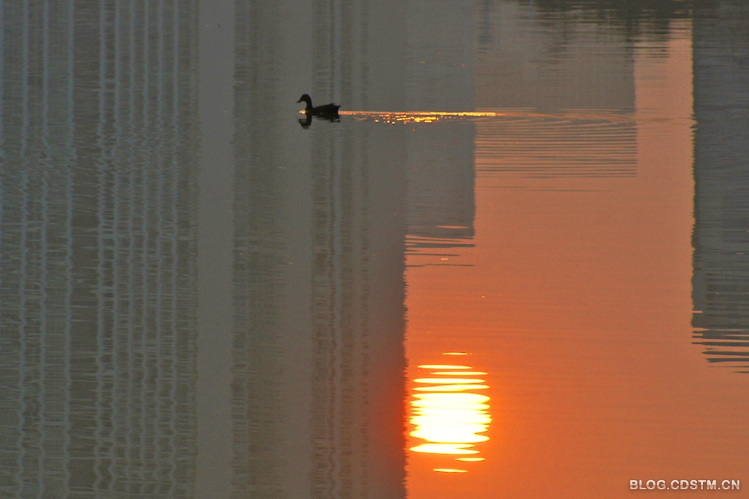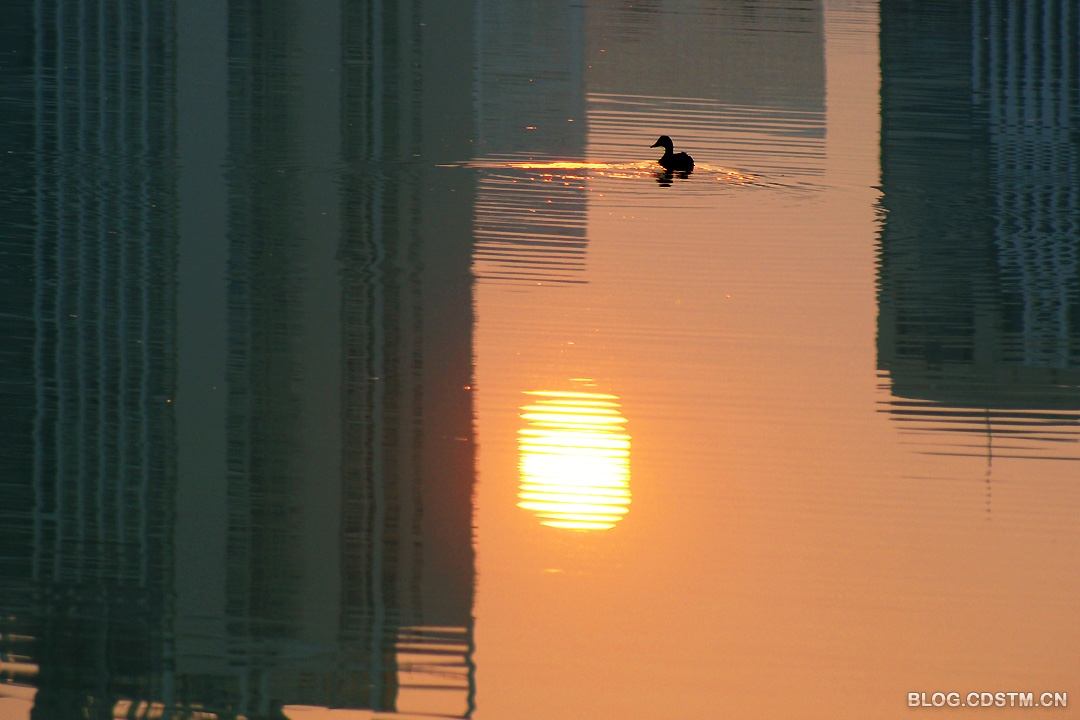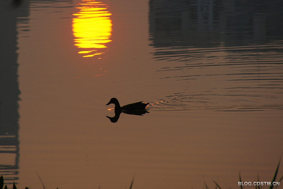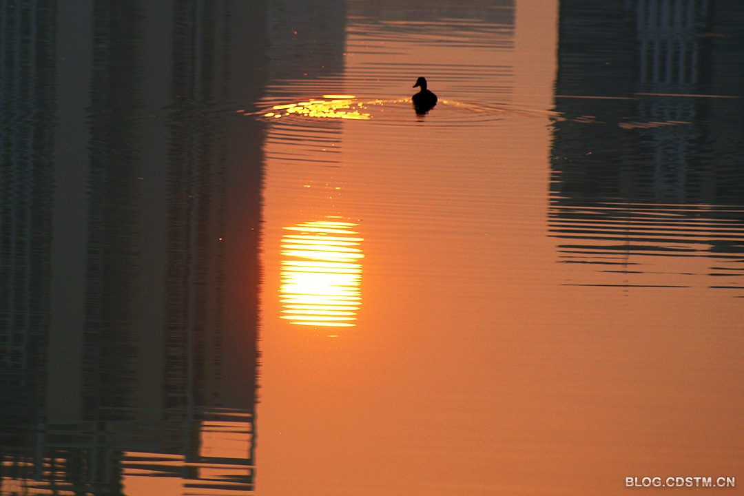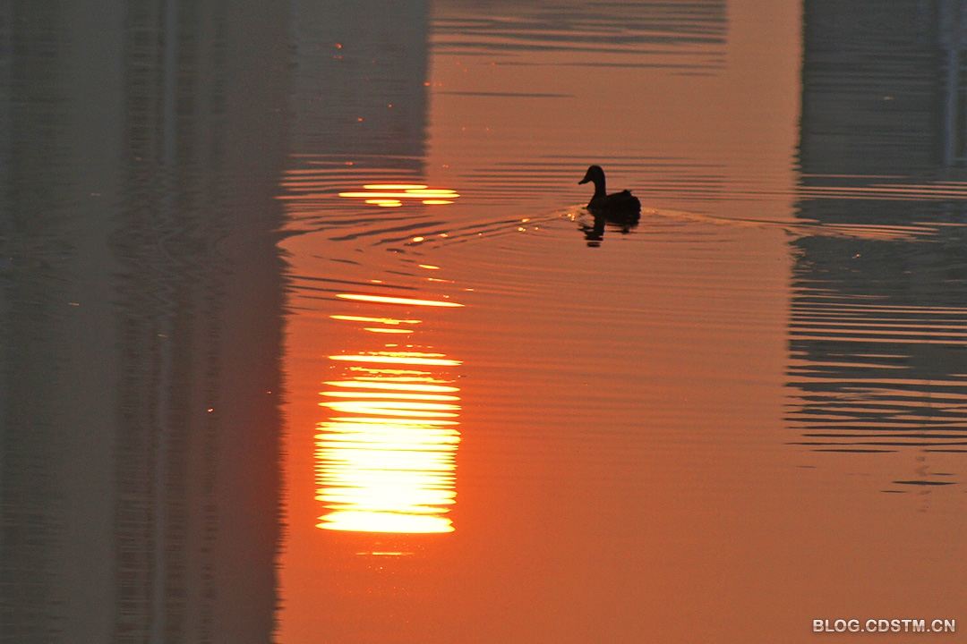3月27日清晨,没雨了。我骑上双轮“宝马”去南湖,6点50分左右,当我赶到中湖时(南湖分上中下3湖),发现一只鸭子孤零零地在湖中游 来游去,似乎是要率先试一试南湖的冷暖。也许是太孤单之故,它不停地鸣叫,真有“几分凄厉,几分抽泣”的感觉。快到7点时,太阳终于露头。这只小鸭迎着朝阳倒影的方向游去,划出漂亮的涟漪。