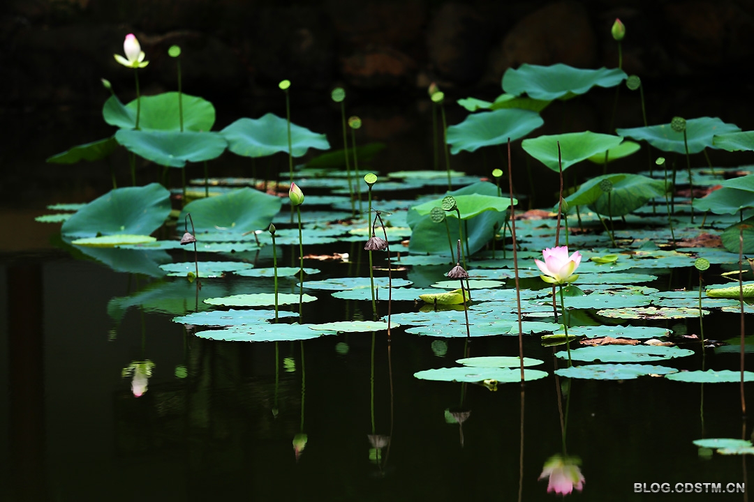 其实,只要处处留心,注意观察,还是可发现亮点,拍到自己心仪的荷花的。6月20日,我和几位南宁市老年大学摄影系的学员一起,到银林山庄去寻找目标,还真遇上了有别于别的地方的荷花——在一仿古亭榭的下方,有几株亭亭玉立的小荷,在水平如镜的池塘一角静静地立着,水中的倒影清新亮丽,活脱脱呈现“出污泥而不染,濯清涟而不妖”的画面。