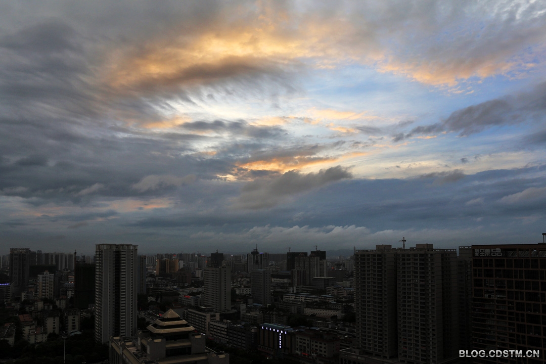 7点10分左右到达楼顶时仍是灰蒙蒙一片,还不时有乌云自南向北移动,但高空处有个缺口,透出一小片淡淡的蓝天和没有层次的白 云。几分钟后,这片白云被透过云层的夕光反射,形成淡淡的虹云(淡的虹云在数码机中一般不显现,除非用ARW格式拍照,后期 时可让其现身)。 有了这点变化,我觉得有”戏“,于是继续等下去。到了7点29分,西北方向出现一只淡黄色的大”眼睛“。但没过多久,天空又 被乌云覆盖。