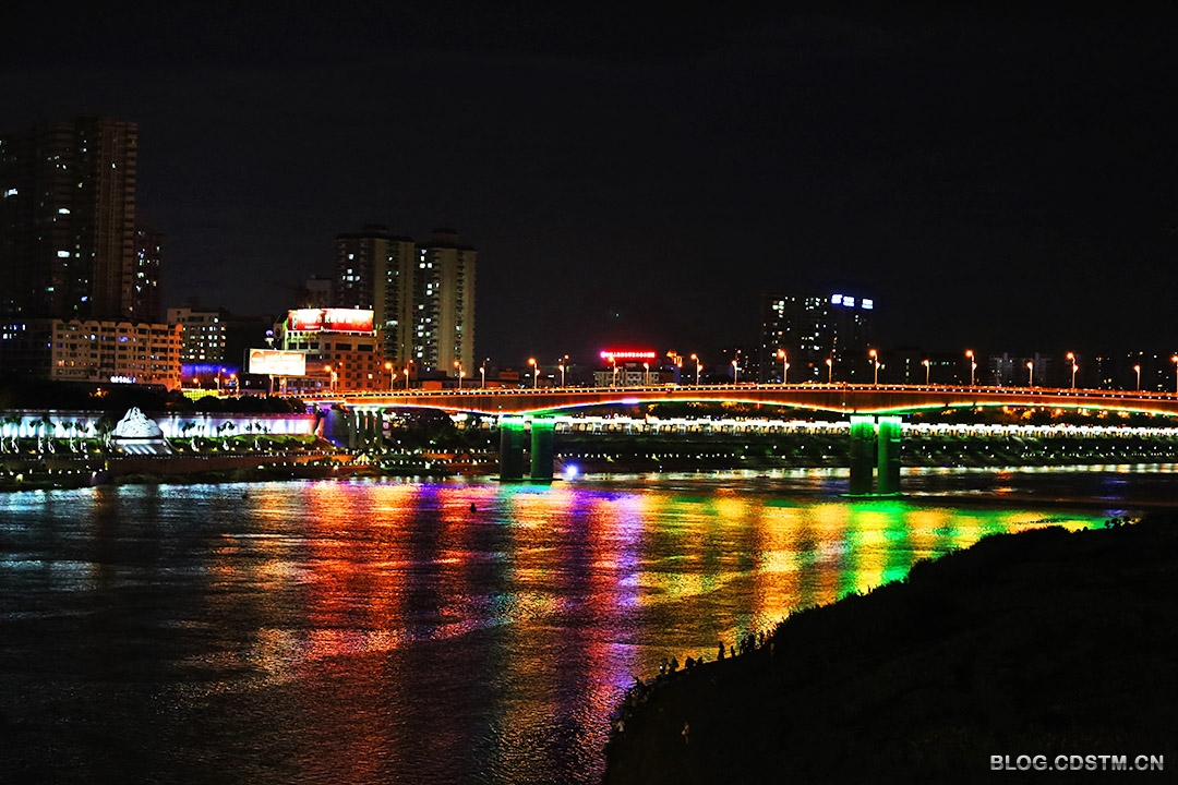 7月12日晚,我去拍晚霞回来路过邕江一桥时,见其东边不远处的桃源大桥灯火通明,灯光映照在江边面,随着灯光色彩的变化,变换出一幅幅五彩缤纷的画图。