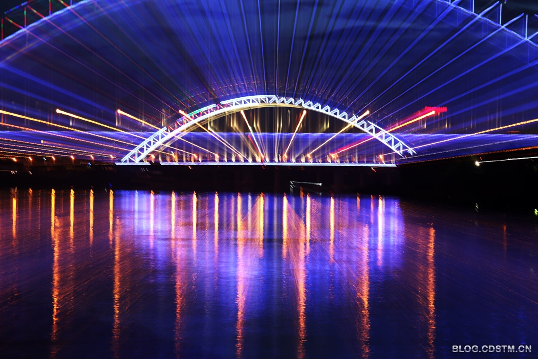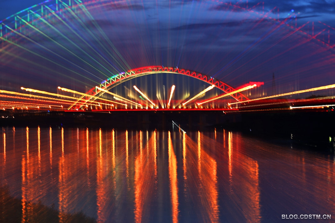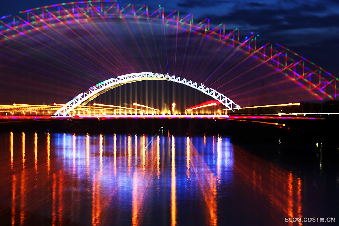 总不能白跑一趟啊。拍不到晚霞就拍点别的吧。还好,11日晚亮化灯没亮的永和大桥,今晚8点齐齐亮了起来,给我找到了拍片的题材——江上“彩虹”。