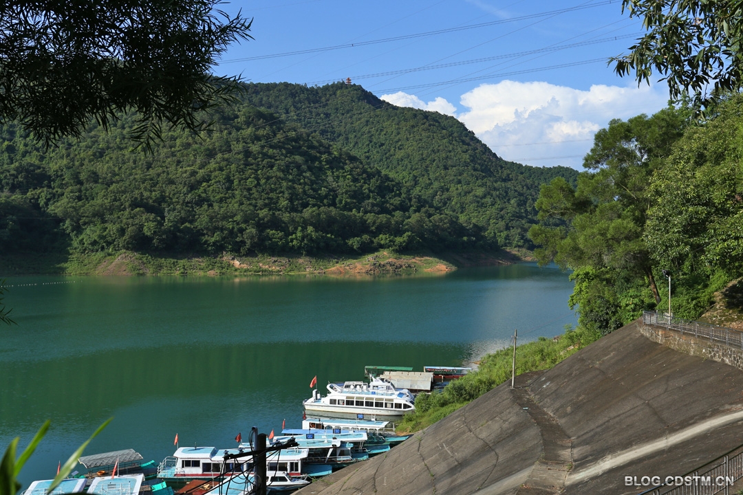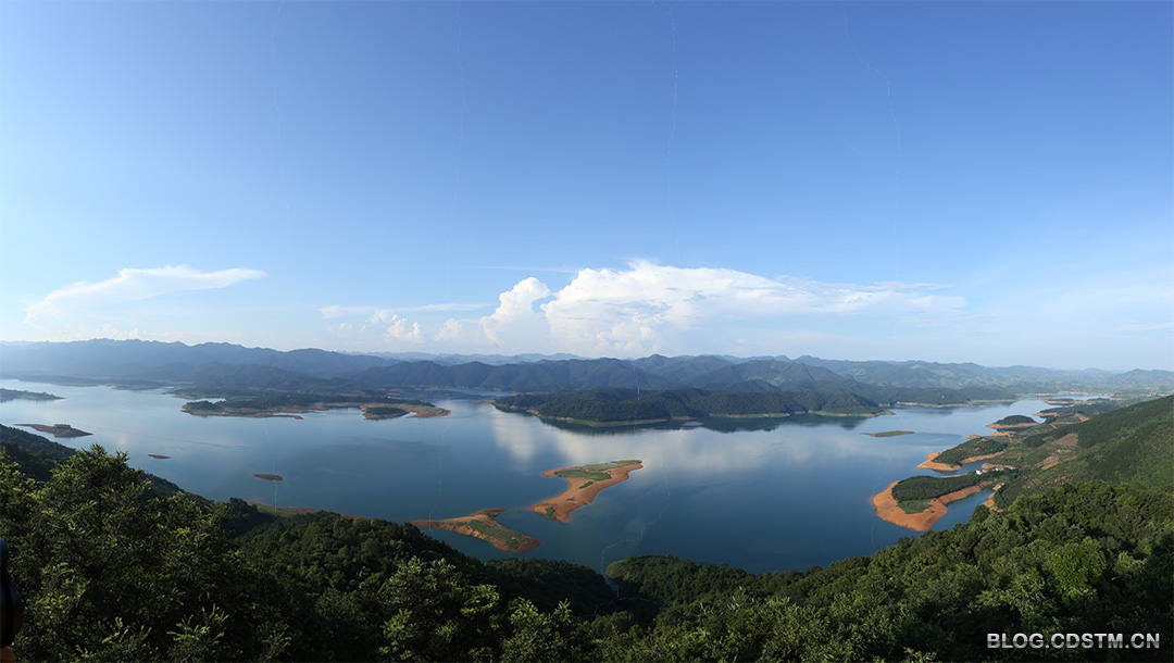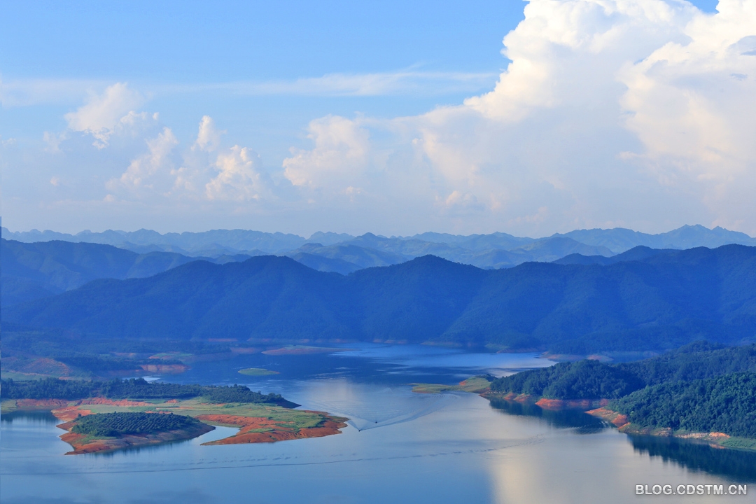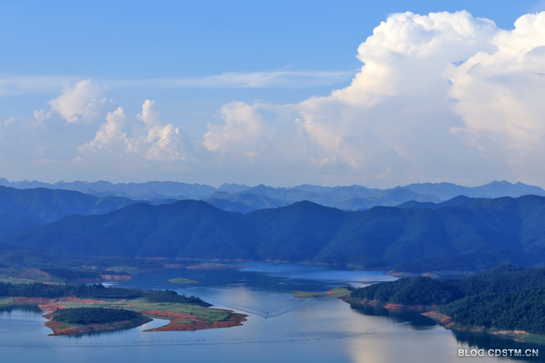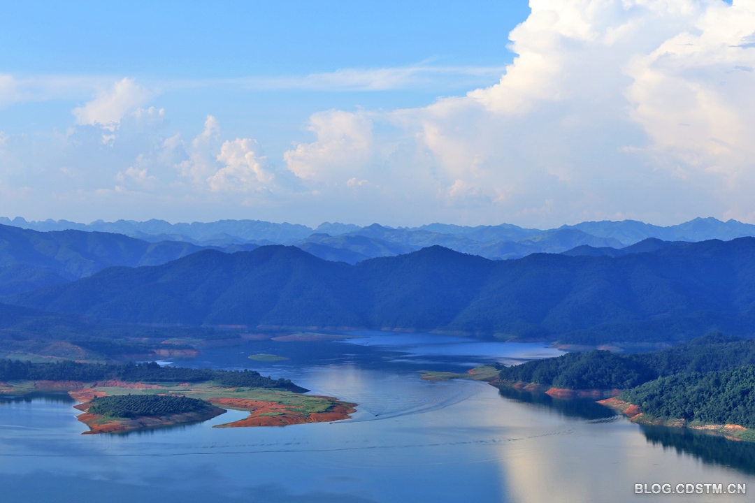 2014年7月22日至25日,我有幸参加广西文联组织的“我们的中国梦.美丽西江”文艺创作采风团赴百色、田阳、田东、平果、隆安采风。22日,在结束了百色水利枢纽的创作采风后,于当天下午6点登上水库大坝西北的山顶,一览澄碧湖全景。在万山叠翠之中,碧波荡漾,远处,两叶轻舟犁开湖面,拖开扇形的细浪,特别赏心悦目。湛蓝的天空,飘着层次丰富的雪白云团, 与青山碧水相辉映,构成一幅一望无际的山水画。