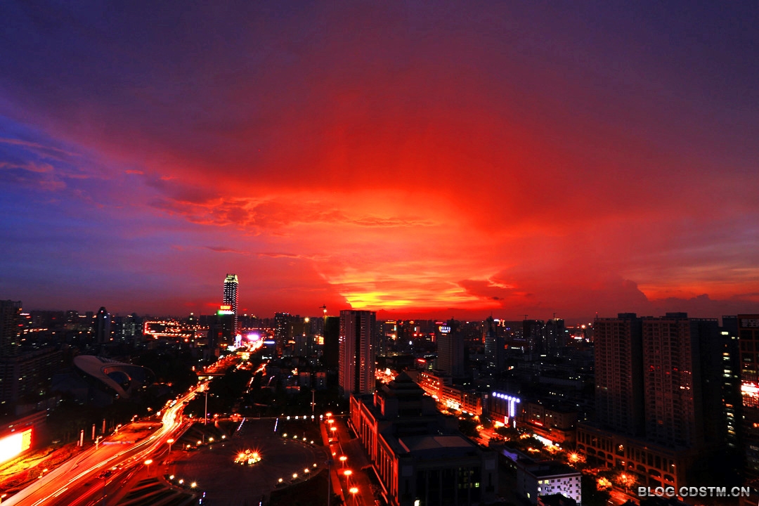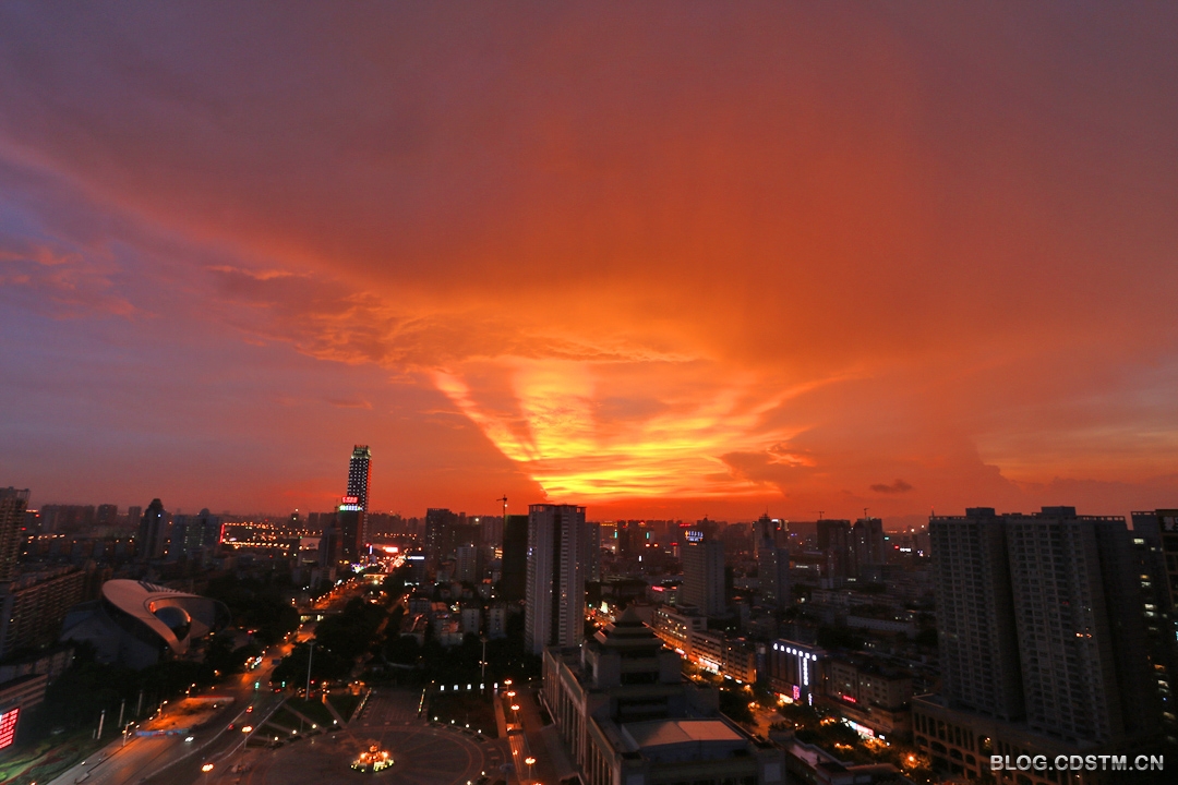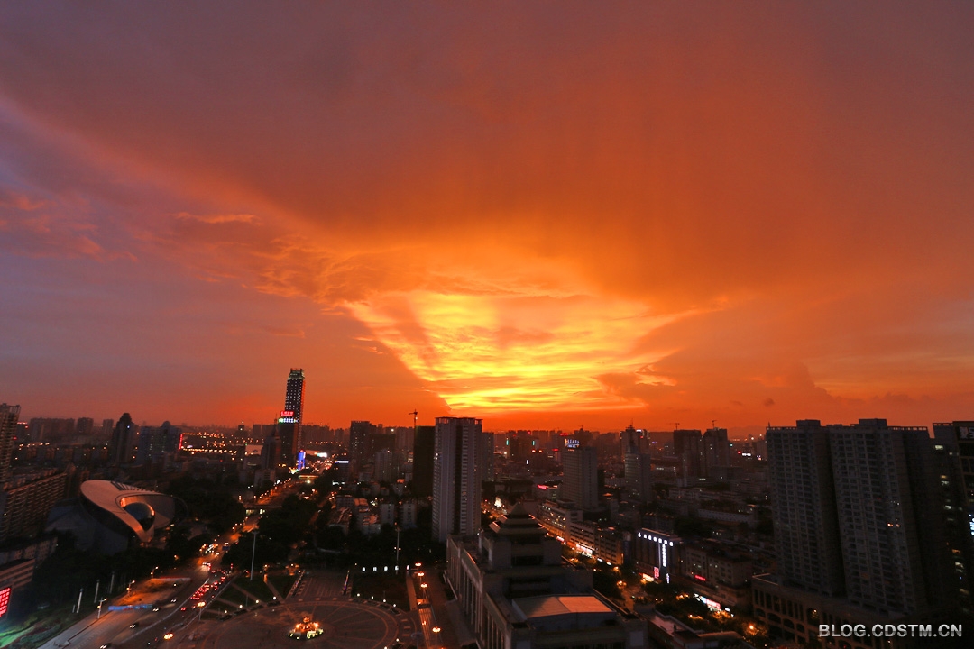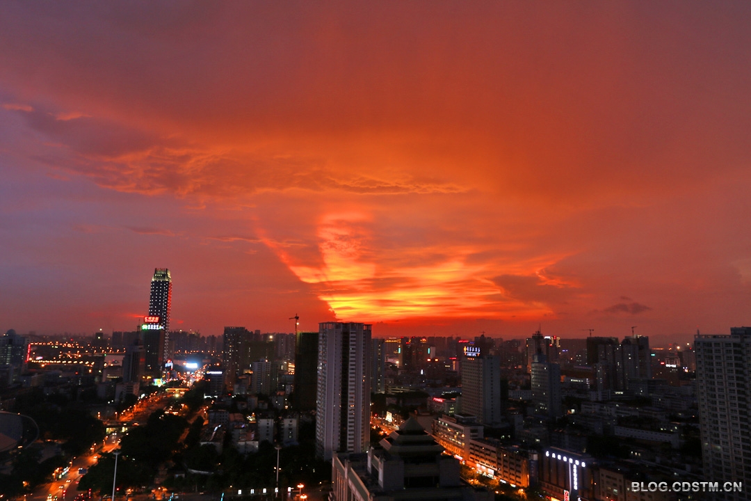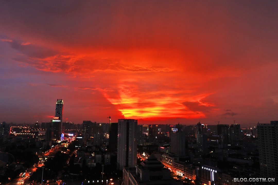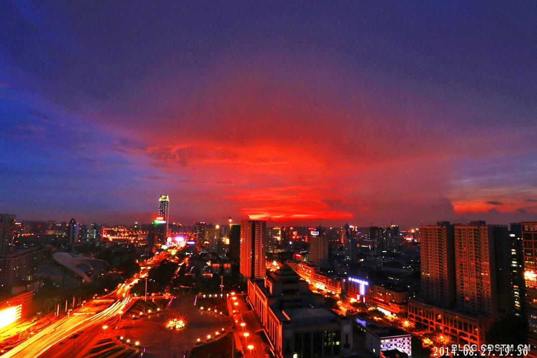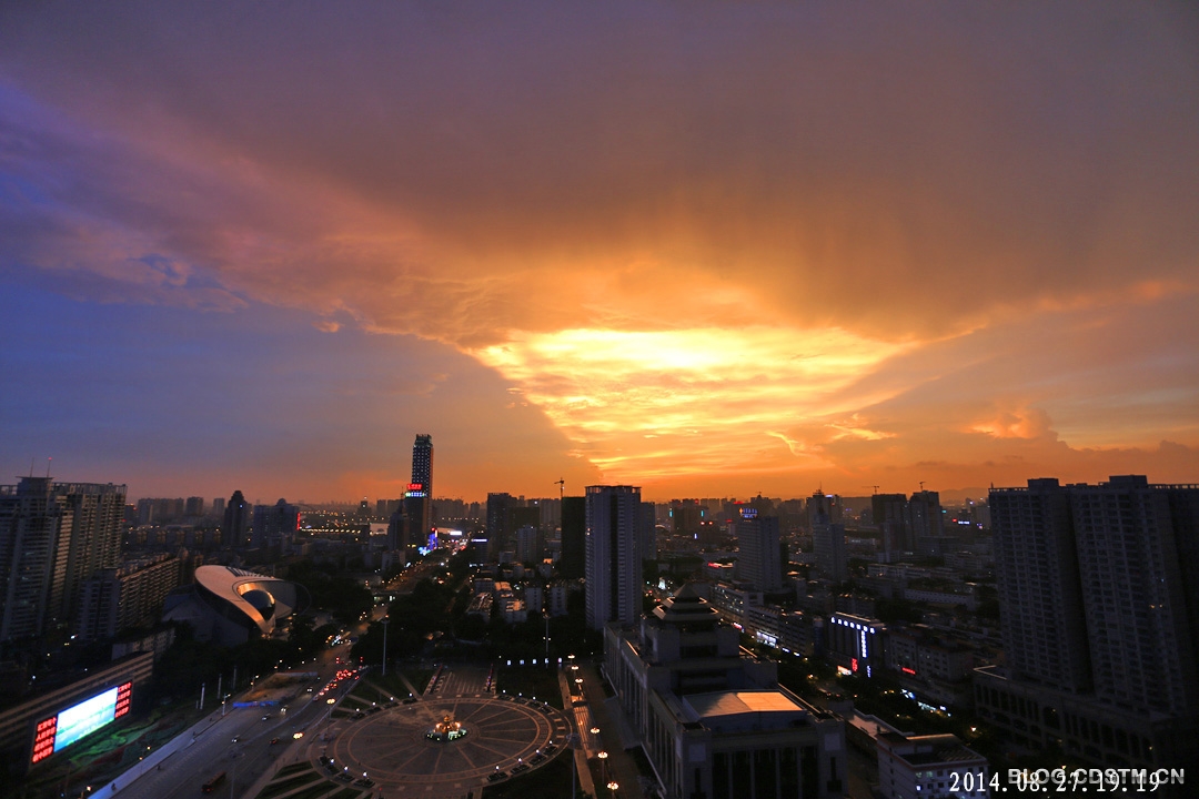 2014年8月27日傍晚,南宁下着小雨。19点过后,西边的天空忽然出现黄色的亮光。按以往的经验,我觉得会有灿烂的晚霞出现,于是背起相机赶到附近的高楼楼顶,果然眼前一片扇形的金霞,非常耀眼。随着时间的推移,19点30分霞光由金 黄渐渐变成桔红色,非常壮观。这是2014年以来最灿烂的晚霞。